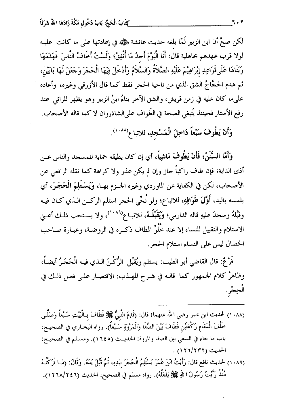 لكن صحَّ أن ابن الزبير لَمَّا بلغه حديث عائشة - رضي الله عنه - في إعادتها على ما كانت عليه لولا قرب عهدهم بجاهلية قال: أَنَا الْيَوْمَ أَجِدُ مَا أُنْفِقُ؛ وَلَسْتُ أَخَافُ النَّاسَ فَهَدَمَهَا وَبَنَاهَا عَلَى قَوَاعِدِ إِبْرَاهِيْمَ عَلَيْهِ الصُّلَاةُ وَالسَّلَامُ وَأَدْخَلَ فِيْهَا الْحَجَرَ وَجَعَلَ لَهَا بَابَيْنِ، ثم هدم الحجَّاجُ الشق الَّذي من ناحية الحجر فقط كما قال الأزرقى وغيره، وأعاده على ما كان عليه في زمن قريش، والشق الآخر بناءُ ابنُ الزبير وهو يظهر للرائى عند رفع الأستار فحينئذ يَنبغى الصحة في الطواف على الشاذروان لا كما قاله الأصحاب.