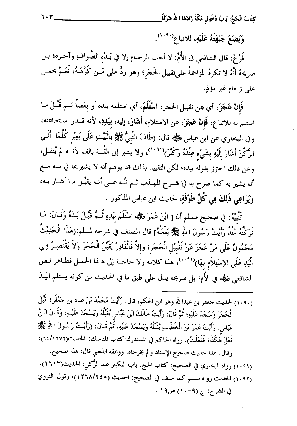 (¬1090) لحديث جعفر بن عبد الله وهو ابن الحكم؛ قال: رَأَيْتُ مُحَمَّدَ بن عباد بن جَعْفَر؛ قَبَّلَ الْحَجَرَ وَسَجَدَ عَلَيْهِ؛ ثُمَّ قالَ: رَأَيْتُ خَالَكَ ابْنَ عَبَّاسٍ يُقَبِّلُهُ وَيَسْجُدُ عَلَيْهِ، وَقَالَ ابْنُ عَبَّاسٍ: رَأَيْتُ عُمَرَ بْنَ الْخَطْابِ يُقَبِّلُهُ وَيَسْجُدُ عَلَيْهِ، ثُمَّ قالَ: (رَأيْتُ رَسُولَ اللهِ - صلى الله عليه وسلم - فَعَلَ هَكَذَا؛ فَفَعَلْتُ). رواه الحاكم في المستدرك: كتاب المناسك: الحديث (1672/ 64)، وقال: هذا حديث صحيح الإسناد ولم يخرجاه. ووافقه الذهبي قال: هذا صحيح.