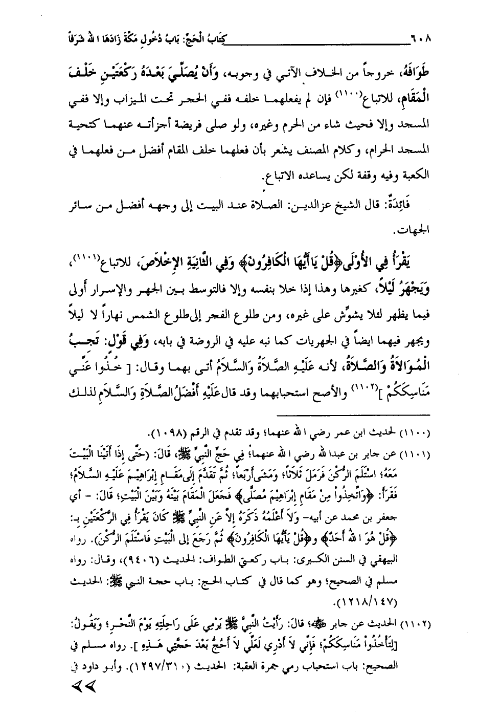 (¬1101) عن جابر بن عبد الله رضى الله عنهما؛ فِي حَجِّ النَّبِيِّ - صلى الله عليه وسلم -، قَالَ: (حَتَّى إِذَا أَتَيْنَا الْبَيْتَ مَعَهُ؛ اسْتَلَمَ الرُّكْنَ فَرَمَلَ ثَلَاثًا؛ وَمَشَى أَرْبَعًا؛ ثُمَّ تَقَدَّمَ إِلَى مَقَامِ إِبْرَاهِيْمَ عَلَيْهِ السَّلَامُ؛ فَقَرأ: {وَاتَّخِذُواْ مِنْ مَقَامِ إِبْرَاهِيمَ مُصَلَّى} فَجَعَلَ المَقَامَ بَيْنَهُ وَبَيْنَ الْبَيْتِ؛ قَالَ: - أي جعفر بن محمد عن أبيه - وَلَا أَعْلَمُهُ ذَكَرَهُ إِلَّا عَنِ النَّبِيِّ - صلى الله عليه وسلم - كَانَ يَقْرَأُ فِي الرَّكْعَتَيْنِ بِـ: {قُلْ هُوَ اللهُ أَحَدٌ} و {قُلْ يَا أَيُّهَا الْكَافِرُونَ} ثُمَّ رَجَعَ إِلَى الْبَيْتِ فَاسْتَلَمَ الرُّكْنَ). رواه البيهقي في السنن الكبرى: باب ركعتي الطواف: الحديث (9406)، وقال: رواه مسلم في الصحيح؛ وهو كما قال في كتاب الحج: باب حجة النبي - صلى الله عليه وسلم -: الحديث (147/ 1218).