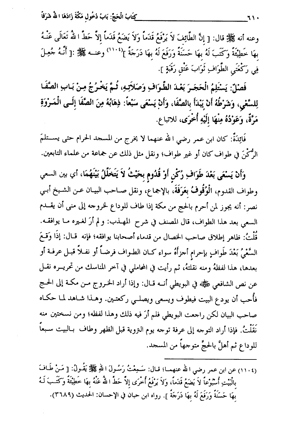 (¬1104) عن ابن عمر رضى الله عنهما؛ قال: سَمِعْتُ رَسُولَ اللهِ - صلى الله عليه وسلم - يَقُولُ: [مَن طَافَ بِالْبَيْتِ أُسْبوْعًا لَا يَضَعُ قَدَمًا، وَلَا يَرْفَعُ أُخْرَى إِلَّا حَطَّ اللَّهُ عَنْهُ بِهَا خَطِيْئَةَ وَكَتَبَ لَهُ بِهَا حَسَنَةً وَرَفَعَ لَهُ بِهَا دَرَجَةً]. رواه ابن حبان في الإحسان: الحديث (3689).