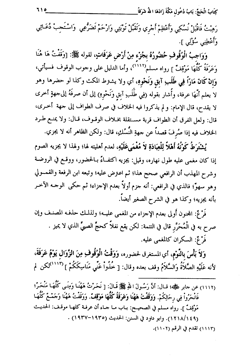 (¬1112) عن جابر - رضي الله عنه -؛ قال: أنَّ رَسُولَ اللهِ - صلى الله عليه وسلم - قَالَ: [نَحَرْتُ هَهُنَا وَمِنَى كُلُّهَا مَنْحَرٌ؛ فَانْحَرُوا فِي رِحَالِكُمْ. وَوَقَفْتُ هَهُنَا وَعَرَفَةُ كُلُّهَا مَوْقِفٌ. وَوَقَفْتُ هَهُنَا وَجَمْعٌ كُلُّهَا مَوْقِفٌ]. رواه مسلم في الصحيح: باب ما جاء أن عرفة كلها موقف: الحديث (149/ 1218). وأبو داود في السنن: الحديث (1935 - 1937).