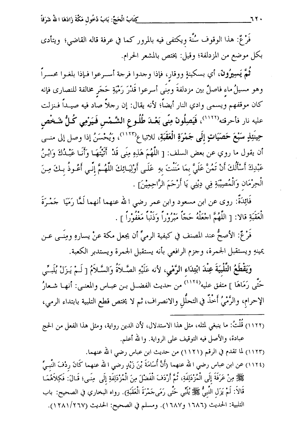 (¬1124) عن ابن عباس رضى الله عنهما (أَنَّ أُسَامَةَ بْنَ زَيْدٍ رضى الله عنهما كَانَ رِدْفَ النَّبِيِّ - صلى الله عليه وسلم - مِن عَرَفَةَ إِلَى الْمُزْدَلِفَةِ، ثُمَّ أَرْدَفَ الفَضْلَ مِنَ الْمُزْدَلِفَةِ إِلَى مِنَى؛ قَالَ: فَكِلاهُمَا قَالا: لَمْ يَزَلِ النَّبِيُّ - صلى الله عليه وسلم - يُلَبِّى حَتَّى رَمَى جَمْرَةَ الْعَقَبَةِ). رواه البخاري في الصحيح: باب التلبية: الحديث (1686 و 1687). ومسلم في الصحيح: الحديث (267/ 1281).