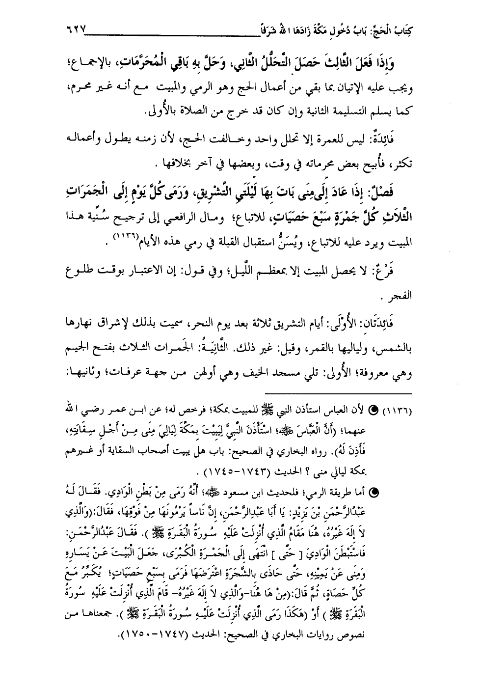 فَصْلٌ: إِذَا عَادَ إِلَى مِنَى بَاتَ بِهَا لَيْلَتَيِ التَّشْرِيقِ، وَرَمَى كُلَّ يَوْمٍ إِلَى الْجَمَرَاتِ الثَّلاثِ كُلَّ جَمْرَةٍ سَبْعَ حَصَيَاتٍ، للاتباع؛ ومال الرافعي إلى ترجيح سُنِّية هذا المبيت ويرد عليه للاتباع، ويُسَنُّ استقبال القبلة في رمي هذه الأيام (¬1136).
