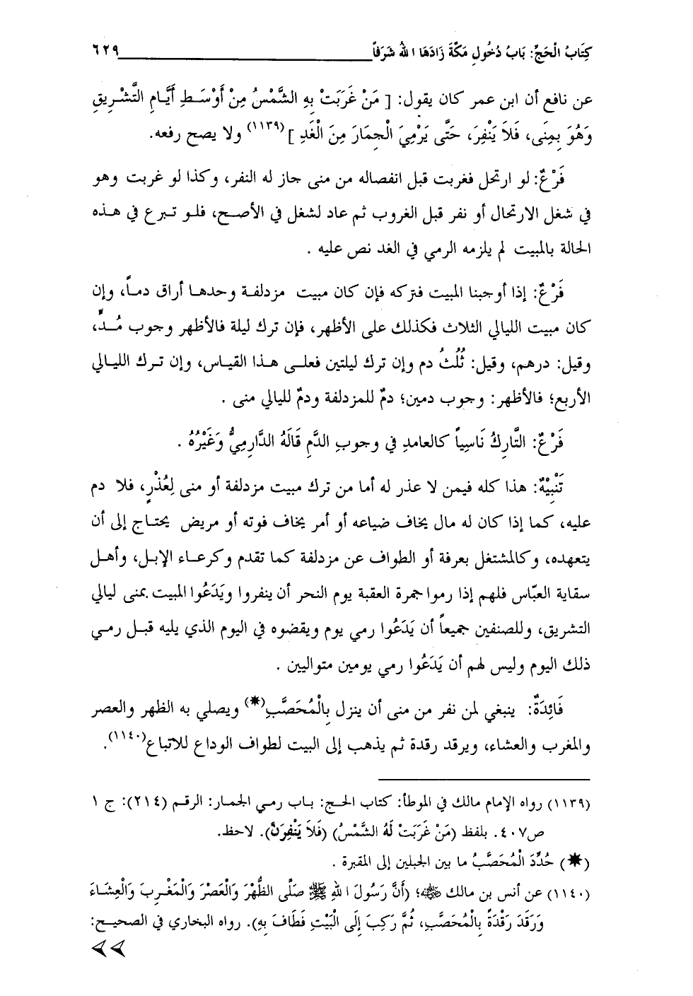 (¬1139) رواه الإمام مالك في الموطأ: كتاب الحج: باب رمى الجمار: الرقم (214): ج 1 ص 407. بلفظ (مَنْ غَرَبَتْ لَهُ الشَّمْسُ) (فلا يَنْفِرَنَّ). لاحظ.