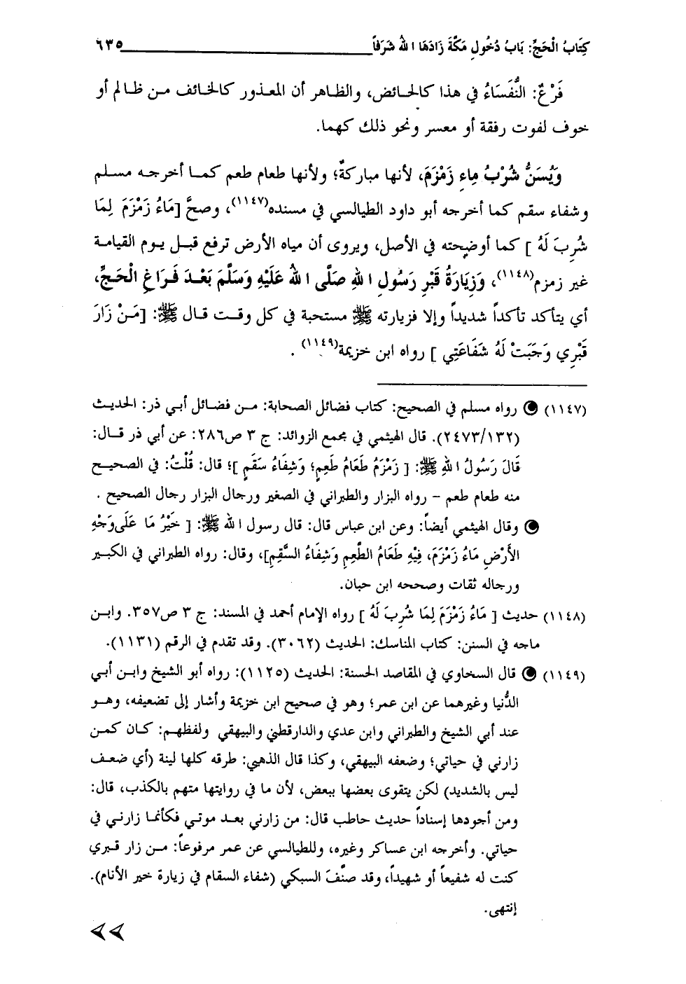ويسَنُّ شُرْبُ مِاءِ زَمْزَمَ، لأنها مباركةٌ؛ ولأنها طعام طعم كما أخرجه مسلم وشفاء سقم كما أخرجه أبو داود الطيالسي في مسنده (¬1147)، وصحَّ [مَاءُ زَمْزَمَ لِمَا شُرِبَ لَهُ] كما أوضحته في الأصل، ويروى أن مياه الأرض ترفع قبل يوم القيامة غير زمزم (¬1148)، وَزِيَارَةُ قَبْرِ رَسُولِ اللهِ صَلَّى الله عَلَيهِ وَسَلَّمَ بَعْدَ فرَاغ الْحَجِّ، أي يتأكد تأكدًا شديدًا وإلا فزيارته - صلى الله عليه وسلم - مستحبة في كل وقت قال - صلى الله عليه وسلم -: [مَنْ زَارَ قَبْرِي وَجَبَتْ لَهُ شَفَاعَتِي] رواه ابن خزيمة (¬1149).