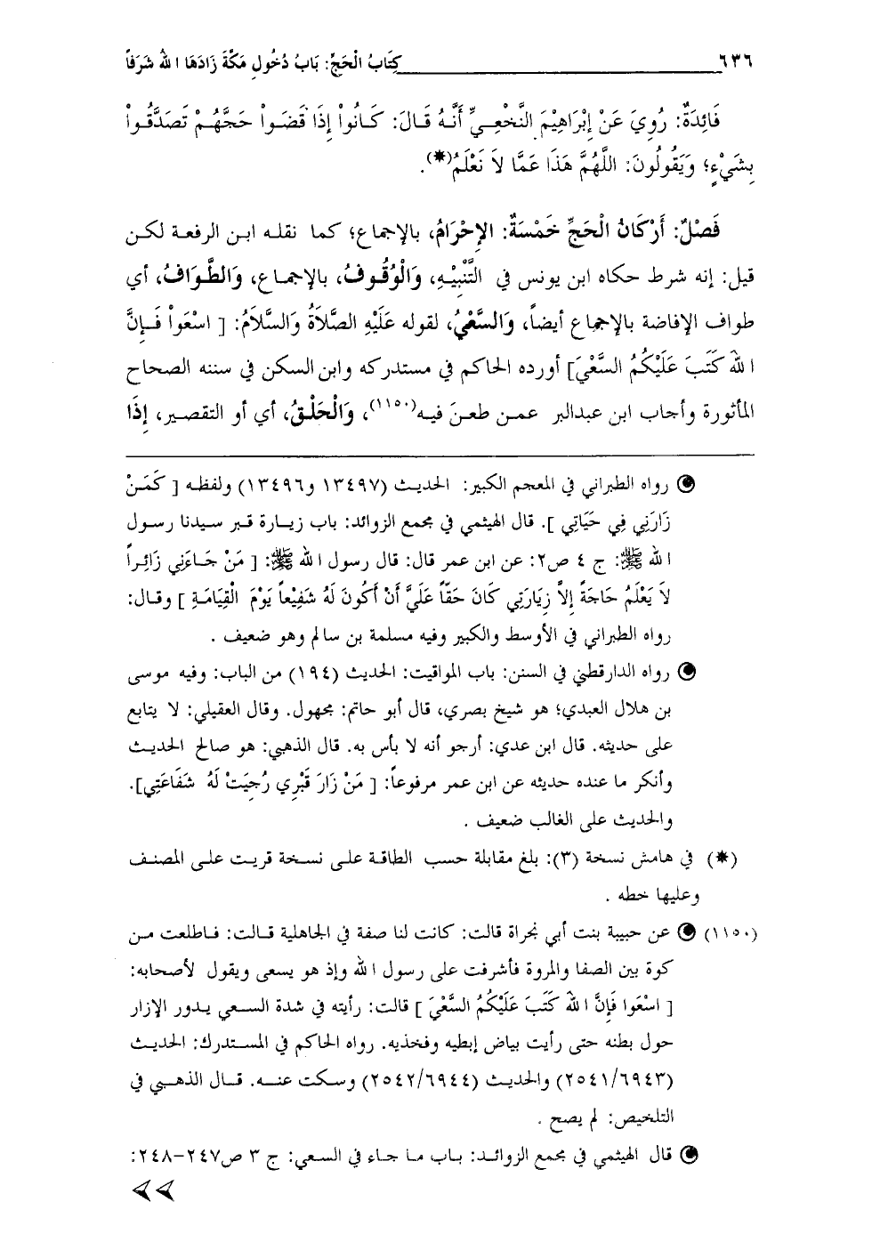 (¬1150) • عن حبيبة بنت أبى نجراة قالت: كانت لنا صفة في الجاهلية قالت: فاطلعت من كوة بين الصفا والروة فأشرفت على رسول الله وإذ هو يسعى ويقول لأصحابه: [اسْعَوا فَإِنَّ الله كَتَبَ عَلَيْكُمُ السَّعْيَ] قالت: رأيته في شدة السعى يدور الإزار حول بطنه حتى رأيت بياض إبطيه وفخذيه. رواه الحاكم في المستدرك: الحديث (6943/ 2541) والحديث (6944/ 2542) وسكت عنه. قال الذهبي في التلخيص: لم يصح.