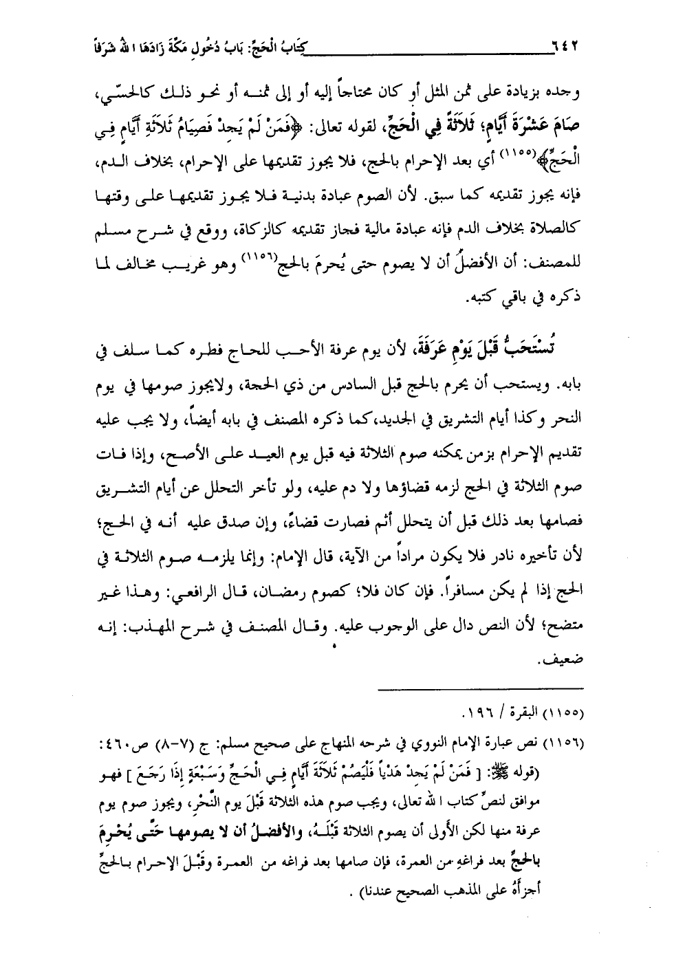(¬1156) نص عبارة الإمام النووي في شرحه المنهاج على صحيح مسلم: ج (7 - 8) ص 460: (قوله - صلى الله عليه وسلم -: [فَمَنْ لَمْ يَجِدْ هَدْيًا فَلْيَصُمْ ثَلاثةَ أيَّامٍ في الْحَجِّ وَسَبْعَةِ إِذَا رَجَعَ] فهو موافق لنصِّ كتاب الله تعالى، ويجب صوم هذه الثلاثة قَبْلَ يوم النَّحْرِ، ويجوز صوم يوم عرفة منها لكن الأولى أن يصوم الثلاثة قَبْلَهُ، والأفضلُ أن لا يصومها حَتى يُحْرِمَ بالحجِّ بعد فراغهِ من العمرة، فإن صامها بعد فراغه من العمرة وقَبْلَ الإحرام بالحج أجزأَهُ على المذهب الصحيح عندنا).