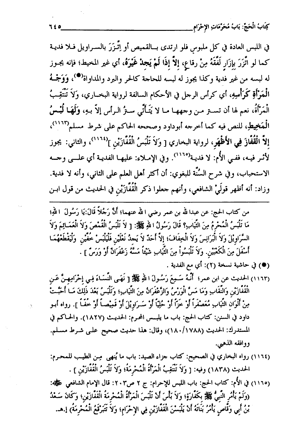 (¬1163) الحديث عن ابن عمر؛ أنهُ يسَمِعَ رَسُولَ الله صلى الله عليه وسلم [نَهَى النِّسَاءَ فِي إِحْرَامِهِنَّ عَنِ القُفَّازَيْنِ وَالنِّقَابِ وَمَا مَسَّ الْوَرْسُ وَالزَّعْفَرَانُ مِنَ الثِّيَابِ؛ وَتَلْبَسْ بَعْدَ ذَلِكَ مَا أَحَبَّتْ مِنْ أَلْوَانِ الثِّيَابِ مُعَصْفَرًا أَوْ خَزًّا أَوْ حُلِيًّا أَوْ سَرَاوِيلَ أَوْ قَمِيصًا أَوْ خُفًّا]. رواه أبو داود في السنن: كتاب الحج: باب ما يلبس المحرم: الحديث (1827). والحاكم لي المستدرك: الحديث (1788/ 180)، وقال: هذا حديث صحيح على شرط مسلم. ووافقه الذهبي.