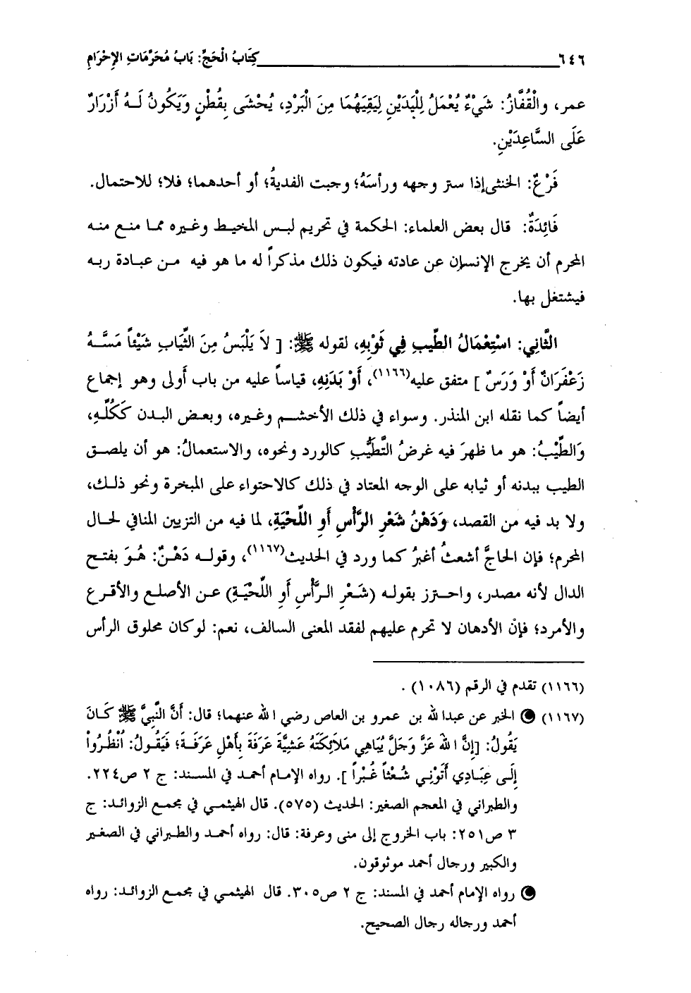 الثَّانِي: استِعْمَالُ الطّيبِ فِي ثَوْبِهِ، لقوله - صلى الله عليه وسلم -: [لا يَلْبَسُ مِنَ الثِّيَابِ شَيْئًا مَسَّهُ زَعْفَرَان أَوْ وَرَسٌ] متفق عليه (¬1166)، أَوْ بَدَنِهِ، قياسًا عليه من باب أَولى وهو إجماع أيضًا كما نقله ابن المنذر. وسواء في ذلك الأخشم وغيره، وبعض البدن كَكُلّهِ، وَالطّيْبُ: هو ما ظهرَ فيه غرضُ التَّطَيُّبِ كالورد ونحوه، والاستعمال: هو أن يلصق الطيب ببدنه أو ثيابه على الوجه المعتاد في ذلك كالاحتواء على المبخرة ونحو ذلك، ولا بد فيه من القصد، وَدَهْنُ شَعْرِ الرَّأسِ أوِ اللِّحْيَةِ، لما فيه من التزيين المنافي لحال المحرم؛ فإن الحاجَّ أشعثُ أغبر كما ورد في الحديث (¬1167)، وقوله دَهْنٌ: هُوَ بفتح الدال لأنه مصدر، واحترز بقوله (شَعْرِ الرَّأْسِ أَوِ اللِّحْيَةِ) عن الأصلع والأقرع والأمرد؛ فإن الأدهان لا تحرم عليهم لفقد المعنى السالف، نعم: لو كان محلوق الرأس