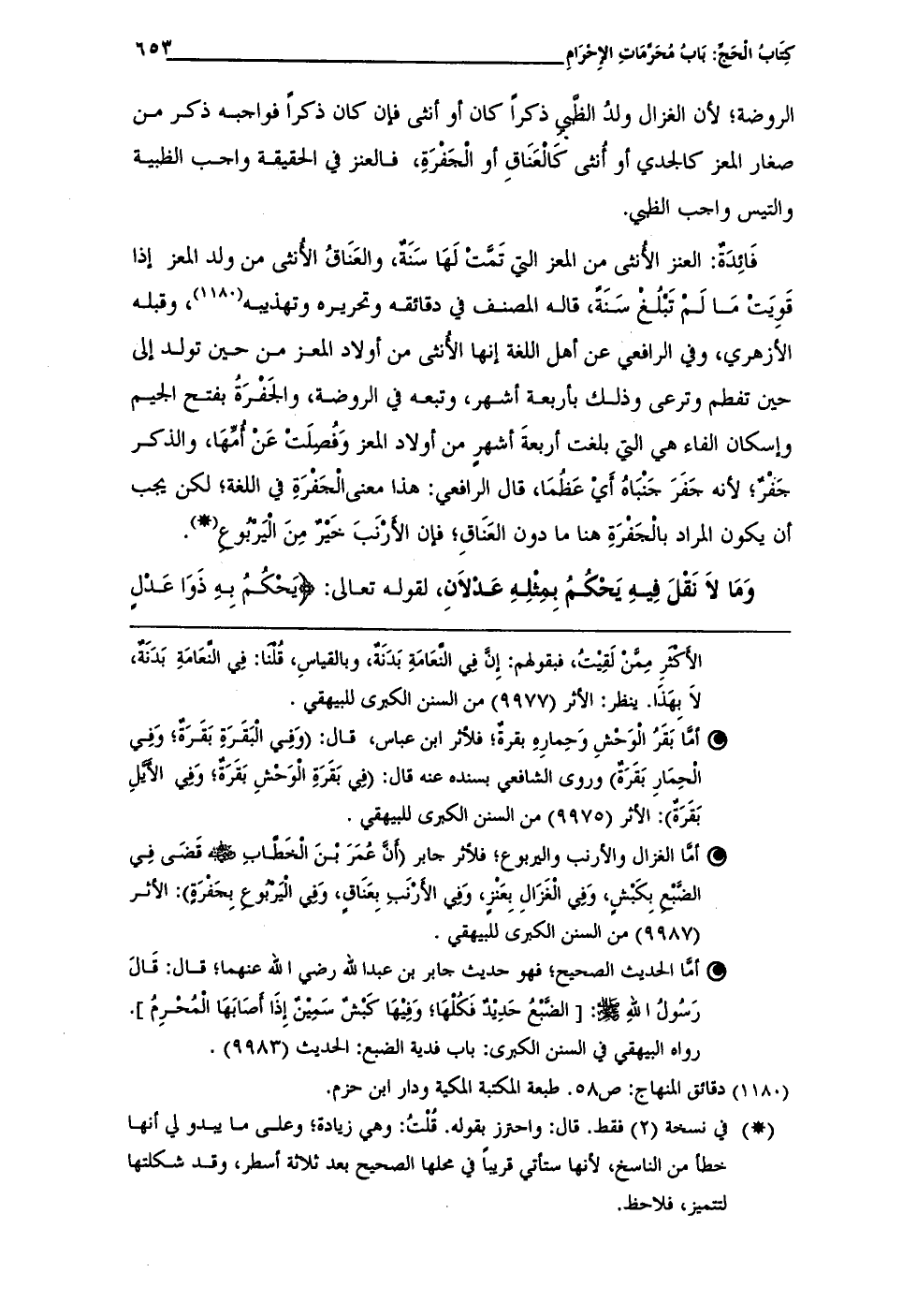 • أمَّا بَقَرُ الوَحْشِ وَحِمارِهِ بقرة؛ فلأثر ابن عباس، قال: (وَفِي الْبَقَرَةِ بَقَرَة؛ وَفِي الْحِمَارِ بَقَرَةٌ) وروى الشافعي بسنده عنه قال: (فى بَقَرَةِ الوَحْشِ بَقَرَةٌ؛ وَفى الأيَّلِ بَقَرَةٌ): الأثر (9975) من السنن الكبرى للبيهقى.
