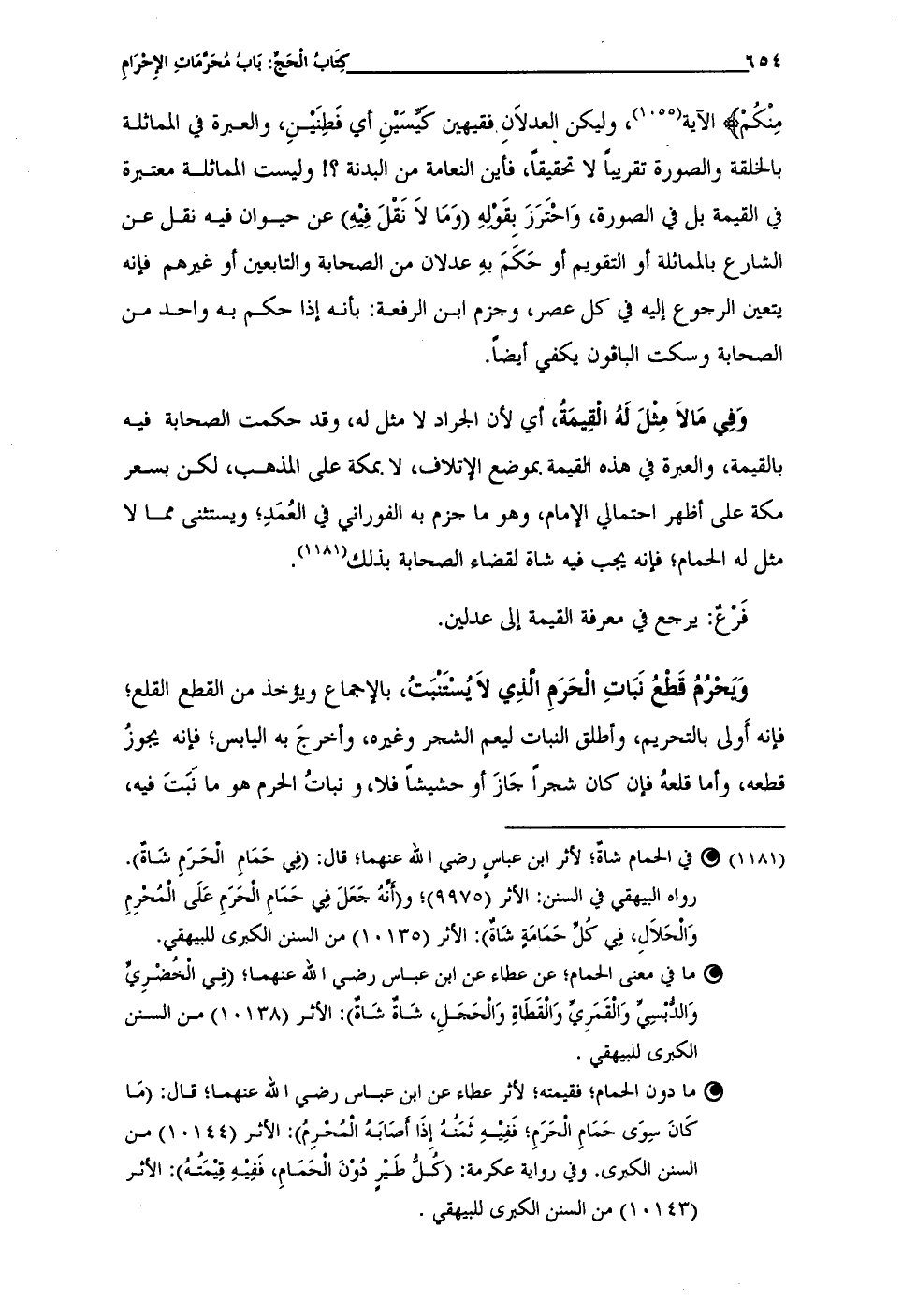 (¬1181) • في الحمام شاةٌ؛ لأثر ابن عباسٍ رضي الله عنهما؛ قال: (في حَمَامِ الْحَرَمِ شَاةٌ). رواه البيهقى في السنن: الأثر (9975)؛ و (أَنَّهُ جَعَلَ فى حَمَامِ الْحَرمِ عَلَى المُحْرِمِ وَالْحَلًالِ، في كُلِّ حَمَامَةِ شَاةٌ): الأثر (10135) من السنن الكبرى للبيهقى.