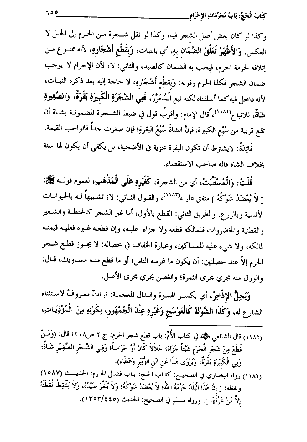 (¬1182) قال الشافعى - رضي الله عنه - في كتاب الأُمِّ: باب قطع شجر الحرم: ج 2 ص 208؛ قال: (وَمَنْ قَطَعَ مِنْ شَجَرِ الحَرَمِ شَيْئًا جَزَاهُ؛ حَلَالًا كَانَ أوْ حَرَامًا؛ وَفِى الشَّجَرِ الصَّغِيْرِ شَاةً؛ وَفِي الكَبِيْرَةِ بَقَرَةٌ، ويروَى هَذَا عَنِ ابْنِ الزُّبَيْرِ وَعَطَاء).