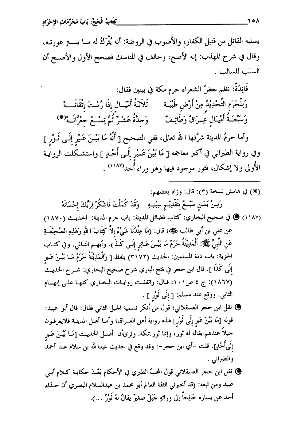 (¬1187) • في صحيح البخاري: كتاب فضائل المدينة: باب حرم المدينة: الحديث (1870) عن علي بن أبى طالب - رضي الله عنه -؛ قال: (مَا عِندَنَا شَئ إِلَّا كِتَابَ اللهِ وَهَذِهِ الصَّحِيفَةِ عَنِ النبِيِّ - صلى الله عليه وسلم -: الْمَدِيْنَةُ حَرَمٌ مَا بَيْنَ عَائِرٍ إِلَى كَذَا). وأبهم الثاني. وفي كتاب الجزية: باب ذمة المسلمين: الحديث (3172) بلفظ [وَالمَدِيْنة حَرَمٌ مَا بَيْنَ عَيرٍ إِلَى كَذَا]. قال ابن حجر في فتح الباري شرح صحيح البخارى: شرح الحديث (1867): ج 4 ص 101: قال: واتفقت روايات البخاري كلها على إبهام الثانى. ووقع عند مسلم: [إِلَى ثَوْرٍ].