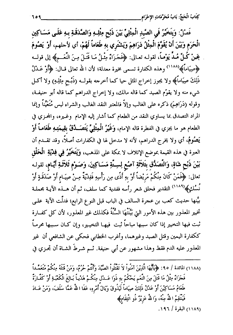 فَصْلٌ: وَيتَخَيَّرُ فَي الصَّيْدِ الْمِثْلِيِّ بَيْنَ ذَبْحِ مِثْلِهِ وَالصَّدَقَةِ بِهِ عَلَى مَسَاكِينِ الْحَرَمِ وَبَينَ أَن يُقَوَّمَ الْمِثْلُ دَرَاهِمَ وَيشْتَرِى بِهِ طَعَامًا لَهُمْ، أي لأجلهم، أوْ يَصُومَ عنْ كُلِّ مُدٌّ يَوْمًا، لقوله تعالى: {فَجَزَاءٌ مِثْلُ مَا قَتَلَ مِنَ النَّعَمِ} إلى قوله {صِيَامًا} (¬1188) وهذه الكفارة تسمى مخيرة معدلة؛ لأن الله تعالى قال: {أَوْ عَدْلُ ذَلِكَ صِيَامًا} ولا يجوز إخراج المثل حيا كما أخرجه بقوله (ذبْحِ مِثْلِهِ) ولا أكل شئ منه ولا يقوّم الصيد كما قاله مالك، ولا إخراج الدراهم كما قاله أبو حنيفة، وقوله (دَرَاهِمَ) ذكره على الغالب وإلّا فالمعتبر النقد الغالب والشراء ليس مُتَعَيِّنًا وإنما المراد التصدق بما يساوي النقد من الطعام كما أشار إليه الإمام وغيره، والمجزي في الطعام هو ما يجزي في الفطرة قاله الإمام، وَغَيْرُ الْمِثْلِيِّ يَتَصَدَّقُ بِقِيمَتِهِ طَعَامًا أَوْ يَصُومُ، أي ولا يخرج الدراهم، لأنه لا مدخل لها في الكفارات أصلًا، وقد تقدم أن العبرة في هذه القيمة بموضع الإتلاف لا بمكة على المذهب، وَيَتَخَيَّرُ فِي فِديَةِ الْحَلْقِ بَيْنَ ذَبْحِ شَاةٍ، وَالتَّصَدُّقِ بِثَلَاثةِ آصُع لِسِتَّةِ مَسَاكِينَ، وَصَوْمِ ثَلَاثَةِ أَيَّامٍ، لقوله تعالى: {فَمَنْ كَانَ مِنْكُمْ مَرِيضًا أَوْ بِهِ أَذًى مِنْ رَأْسِهِ فَفِدْيَةٌ مِنْ صِيَامٍ أَوْ صَدَقَةٍ أَوْ نُسُكٍ} (¬1189) التقدير فحلق شعر رأَسه ففدية كما سلف، ثم أن هذه الآية مجملة بيَّنها حديث كعب بن عجرة السالف في الباب قبل النوع الرابع؛ فدلَّت الآية على تخيير المعذور بين هذه الأمور التي بَيَّنَتْهَا السُّنةُ فكذلك غير المعذور، لأن كل كفارة ثبت فيها التخيير إذا كان سببها مباحًا ثبت فيها التخيير، وإن كان سببها محرمًا ككفارة اليمين وقتل الصيد وغيرهما، وأغرب الخطابي فحكى عن الشافعى أن غير المعذور عليه الدم فقط وهذا مشهور عن أبى حنيفة. ثم شرطَ الشاة أن تجزي في