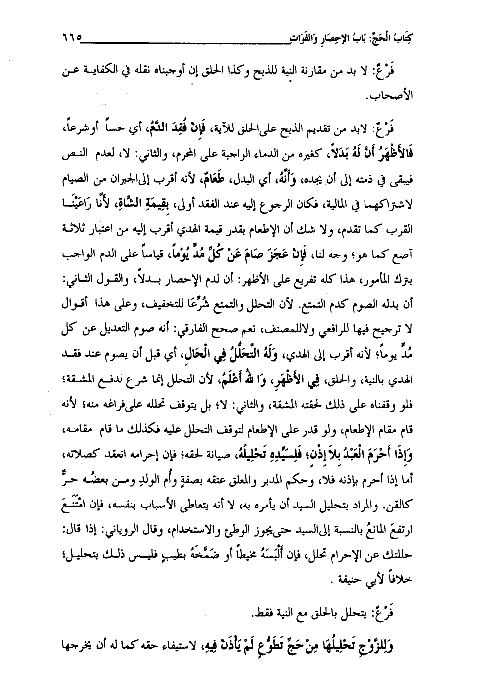 فَرعٌ: لابد من تقديم الذبح على الحلق للآية، فَإن فقِدَ الدم، أي حسًا أو شرعًا، فَالأظْهرُ أن لَهُ بَدلًا، كغيره من الدماء الواجبة على المحرم، والثاني: لا، لعدم النص فيبقى في ذمته إلى أن يجده، وَأنهُ، أي البدل، طَعامٌ، لأنه أقرب إلى الجبران من الصيام لاشتراكهما في المالية، فكان الرجوع إليه عند الفقد أولى، بِقِيمَةِ الشاةِ، لأنا رَاعَيْنَا القرب كما تقدم، ولا شك أن الإطعام بقدر قيمة الهدي أقرب إليه من اعتبار ثلاثة آصع كما هو؛ وجه لنا، فاِن عَجَزَ صَامَ عَنْ كُل مُدٍّ يُوْمًا، قياسًا على الدم الواجب بترك المأمور، هذا كله تفريع على الأظهر: أن لدم الإحصار بدلًا، والقول الثاني: أن بدله الصوم كدم التمتع. لأن التحلل والتمتع شُرِّعَا للتخفيف، وعلى هذا أقوال لا ترجيح فيها للرافعي ولا للمصنف، نعم صحيح الفارقي: أنه صوم التعديل عن كل مُدٍّ يومًا؛ لأنه أقرب إلى الهدي، وَلَهُ التْحَللُ فِي الحَالِ، أي قبل أن يصوم عند فقد الهدي بالنية، والحلق، فى الأظْهرِ، وَالله أَعلَمُ، لأن التحلل إنما شرع لدفع المشقة؛ فلو وقفناه على ذلك لحقته المشقة، والثاني: لا؛ بل يتوقف تحلله على فراغه منه؛ لأنه قام مقام الاطعام، ولو قدر على الإطعام لتوقف التحلل عليه فكذلك ما قام مقامه، وَإِذَا أَحرَمَ العَبد بِلا إِذْن؛ فَلِسَيِّدِهِ تَحلِيلُهُ، صيانة لحقه؛ فإن إحرامه انعقد كصلاته، أما إذا أحرم بإذنه فلا، وحكم المدبر والمعلق عتقه بصفةٍ وأُم الولدِ ومن بعضُه حرٌّ كالقن. والمراد بتحليل السيد أن يأمره به، لا أنه يتعاطى الأسباب بنفسه، فإن امتَنَعَ ارتفعَ المانعُ بالنسبة إلى السيد حتى يجوز الوطئ والاستخدام، وقال الروياني: إذا قال: حللتك عن الإحرام تحلل، فإن أَلبَسَهُ مخيطًا أو ضَمَّخَهُ بطيبٍ فليس ذلك بتحليل؛ خلافًا لأبي حنيفة.