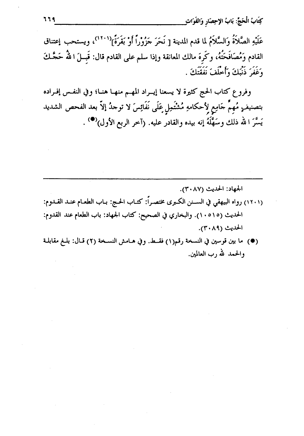 وفروع كتاب الحج كثيرة لا يسعنا إيراد المهم منها هنا؛ وفِى النفس إفراده بتصنيفٍ مُهِمٍّ جَامِع لأحكامهِ مُشتَمِلٍ عَلَى نَفَائِسَ لا توجدُ إلّا بعد الفحص الشديد يَسَّرَ الله ذلك وسَهَّلَهُ إنه بيده والقادر عليه. (آخر الربع الأول) (•).