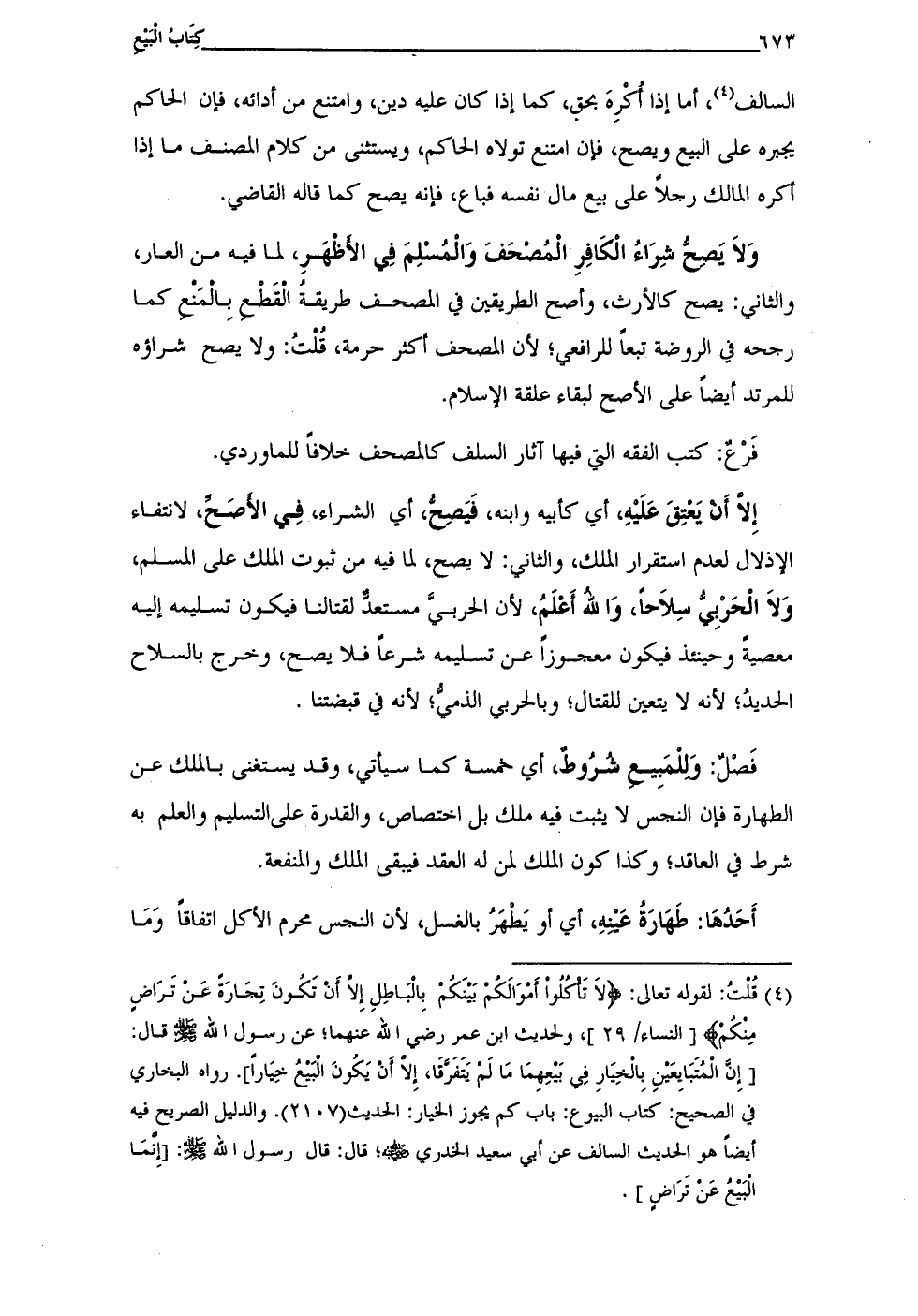 (¬4) قلْتُ: لقوله تعالى: {لَا تَأْكُلُوا أَمْوَالَكُمْ بَيْنَكُمْ بِالْبَاطِلِ إِلَّا أَنْ تَكُونَ تِجَارَةً عَنْ تَرَاضٍ مِنْكُمْ} [النساء: 29]، ولحديث ابن عمر رضى الله عنهما؛ عن رسول الله - صلى الله عليه وسلم - قال: [إِن الْمُتَبَايِعَيْنِ بِالخِيَارِ في بيْعِهِمَا مَا لَم يَتَفَرقا، إِلَّا أَنْ يَكُونَ البَيعُ خِيَارًا]. رواه البخاري في الصحيح: كتاب البيوع: باب كم يجوز الخيار: الحديث (2107). والدليل الصريح فيه أيضًا هو الحديث السالف عن أبي سعيد الخدرى - رضي الله عنه -؛ قال: قال رسول الله - صلى الله عليه وسلم -: [إِنمَا البَيْعُ عَنْ تَرَاضٍ].