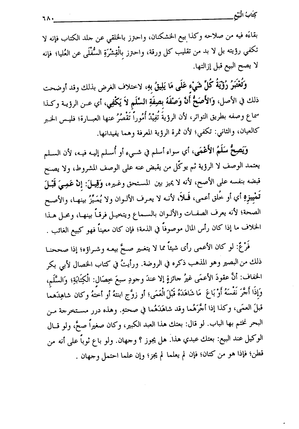 فَرعٌ: لو كان الأعمى رأى شيئًا مما لا يتغير صحَّ بيعه وشراؤه؛ إذا صححنا ذلك من البصير وهو المذهب ذكره في الروضة. ورأيتُ في كتاب الخصال لأبي بكر الخفاف: أنَّ عقودَ الأعمَى غيرُ حائزةٍ إلا عندَ وجودِ سبعَ خِصَالٍ: الْكِتَابَةِ؛ وَالسَّلَمِ، وَإِذَا أَجَّرَ نَفْسَهُ أوْ بَاعَ مَا شَاهدَهُ قَبْلَ الْعَمَى؛ أو زوَّج ابنتهُ أو أختهُ وكان شاهِدَهما قبلَ العمَى، وكذا إذا أجَّرَهُما وقد شاهدَهُما في صحتهِ. وهذه درر مستَخرجة من البحر نختم بها الباب. لو قال: بعتك هذا العبد الكبير، وكان صغيرًا صحَّ، ولو قال الوكيل عند البيع: بعتك عبدي هذا هل يجوز؟ وجهان. ولو باع ثوبًا على أنه من قطن؛ فإذا هو من كتان؛ فإن لم يعلما لم يجز؛ وإن علما احتمل وجهان.