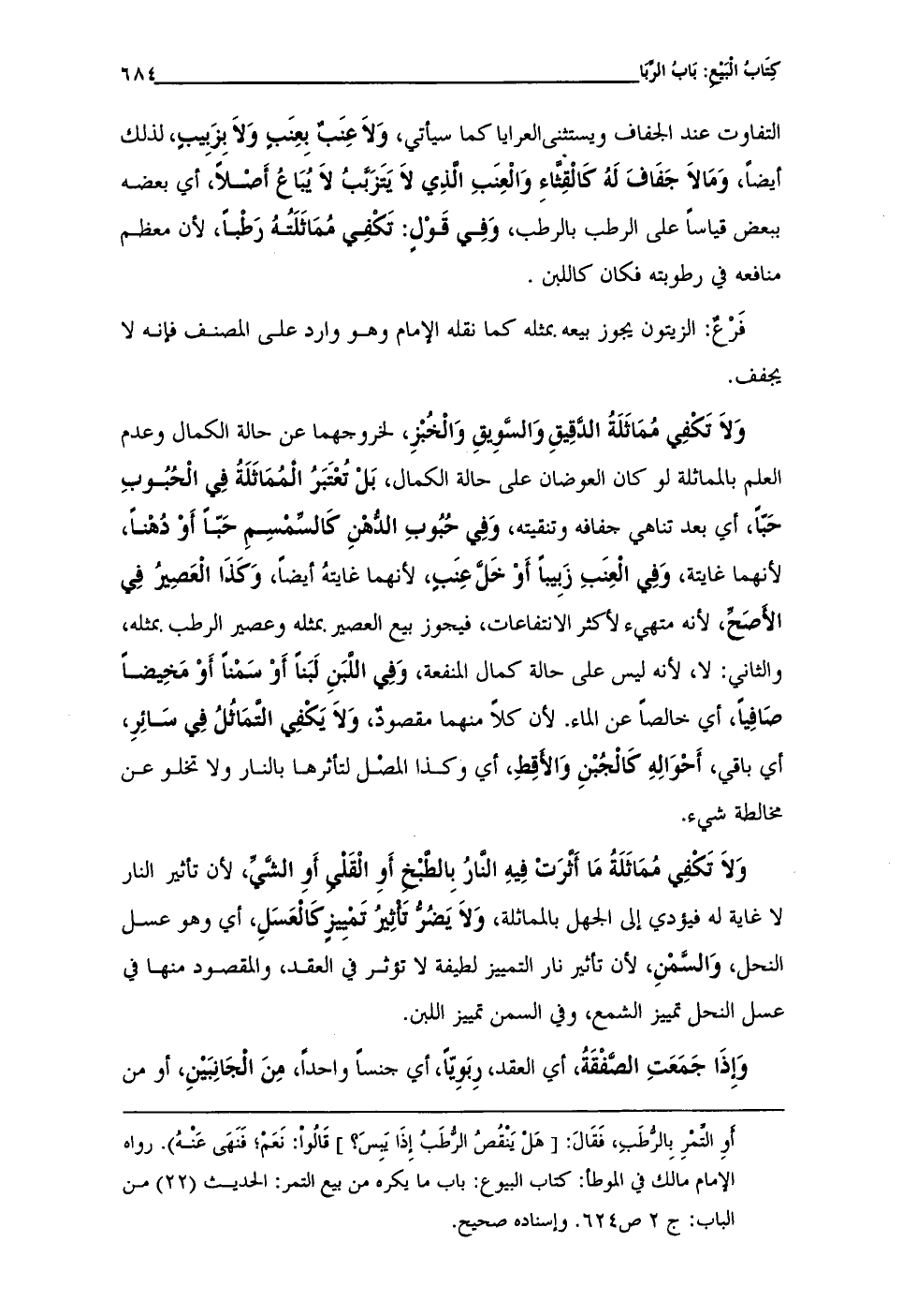 أوِ التمرِ بِالرطَبِ، فَقَالَ: [هلْ يَنْقُصُ الرُّطَبُ إِذَا يَبِسَ؟ ] قَالُوا: نَعَم؛ فَنَهى عَنْهُ). رواه الإمام مالك في الموطأ: كتاب البيوع: باب ما يكره من بيع التمر: الحديث (22) من الباب: ج 2 ص 624. وإسناده صحيح.