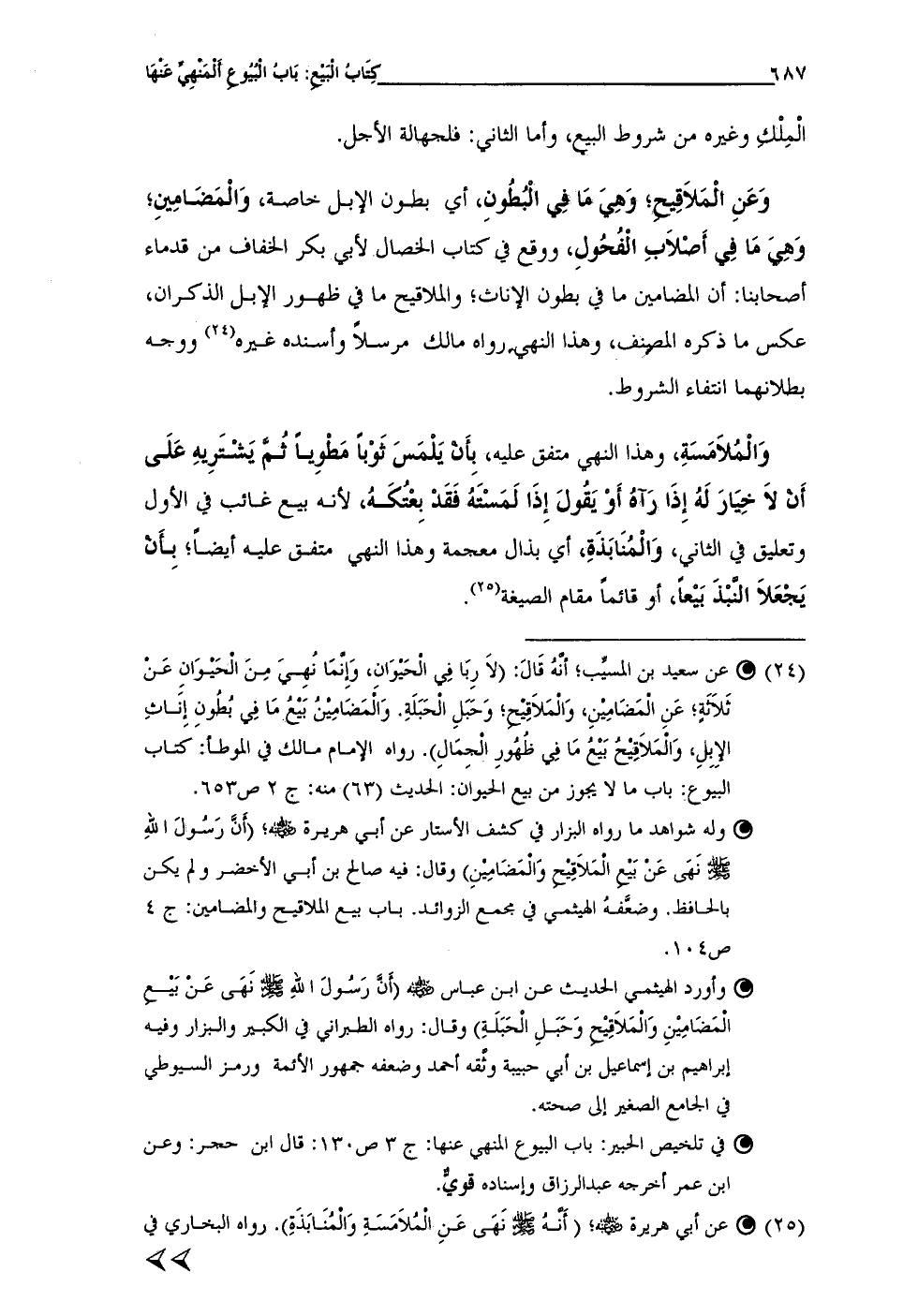 (¬24) • عن سعيد بن المسيَّب؛ أنْهُ فَالَ: (لا رِبَا في الحيوَانِ، وَإِنْمَا نُهِيَ مِنَ الحيوان عَنْ ثَلاثة؛ عَنِ المَضَامِينِ، وَالمَلاقِيْح؛ وَحَبَلِ الحَبَلَةِ. وَالمَضَامِينُ بَيْعُ مَا في بُطُون إِنَاثِ الإبِلِ؛ وَالمَلاقيحُ بَيْعُ مَا في ظُهُورِ الجِمَالِ). رواه الإمام مالك في الموطأ: كتاب البيوع باب ما لا يجوز من بيع الحيوان: الحديث (63) منه: ج 2 ص 653.