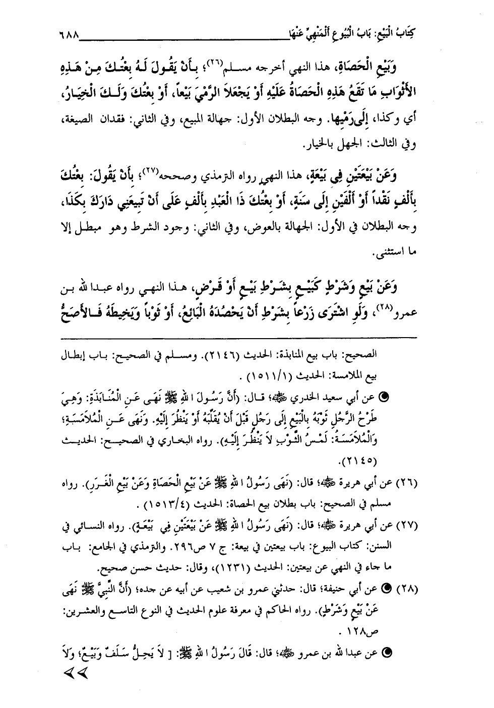 (¬26) عن أبي هريرة - رضي الله عنه -؛ قال: (نَهى رَسُولُ اللهِ - صلى الله عليه وسلم - عَن بَيع الحَصَاةِ وَعَنْ بَيع الْغَرَرِ). رواه مسلم في الصحيح: باب بطلان بيع الحصاة: الحدبث (4/ 1513).