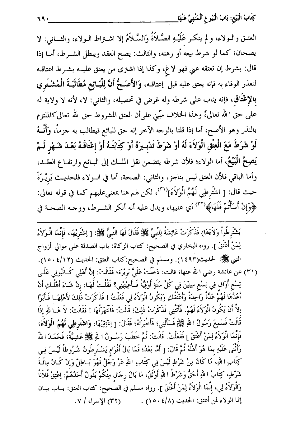 = يَشْتَرِطُوأ وَلًاءَها) فَذَكَرَتْ عَائِشَةُ لِلنبِيِّ - صلى الله عليه وسلم - فَقَالَ لَها النْبِى - صلى الله عليه وسلم -: [اِشتَرِيها، فَإِنْمَا الْوَلاءُ لِمَنْ أَعتَقَ]. رواه البخاري في الصحيح: كتاب الزكاة: باب الصدقة على موالي أزواج النبي - صلى الله عليه وسلم -: الحديث (1493). ومسلم في الصحيح: كتاب العتق: الحديث (12/ 1504).