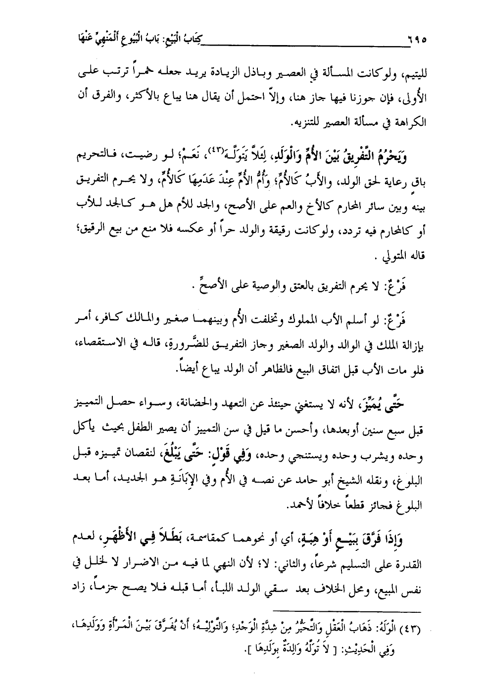 وَيَحرُمُ التفْرِيقُ بَيْنَ الأمِّ وَالْوَلَدِ، لِئَلَّا يَتَوَلَّه (¬43)، نَعَم؛ لو رضيت، فالتحريم باقٍ رعاية لحق الولد، والأبُ كَالأم؛ وَأُم الأمِّ عِنْدَ عَدَمِها كَالأمِّ، ولا يحرم التفريق بينه وبين سائر المحارم كالأخ والعم على الأصح، والجد للأم هل هو كالجد للأب أو كالمحارم فيه تردد، ولو كانت رقيقة والولد حرًا أو عكسه فلا منع من بيع الرقيق؛ قاله المتولي.