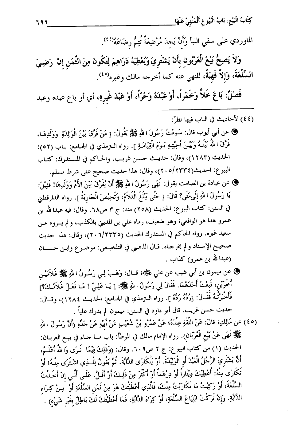 • عن ميمون بن أبى شيب عن علي - رضي الله عنه -؛ قال: وَهبَ لِي رسول اللهِ - صلى الله عليه وسلم - غُلامَيْنِ أَخَوينِ، فَبِعتُ أحَدَهُمَا. فَقَالَ لِى رَسُولُ اللهِ - صلى الله عليه وسلم -: [يَا عَلِي! مَا فَعَلَ غلامُكَ؟ ] فَأخبرتُهُ فَقَالَ: [رُدَّةُ رُدَّهُ]. رواه الترمذي في الجامع: الحديث 1284)، وقال: حديث حسن غريب. قال أبو داود في السنن: ميمون لم يدرك عليًا.