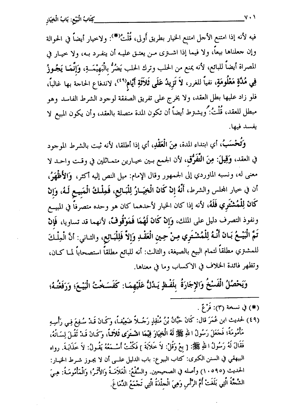 (¬49) لحديث ابن عُمَرَ قال: كَانَ حبانُ بنُ مُنقِذٍ رَجُلًا ضَعِيفًا، وَكَانَ قَدْ سُفِعَ في رَأسِهِ مَأمُومَةَ؛ فَحَعَلَ رَسُولُ الله - صلى الله عليه وسلم - لَهُ الخيارَ فِيْمَا اشتَرَى ثَلاثًا، وَكَانَ قد ثَقُلَ لِسَانُهُ، فَقَالَ لَهُ رَسُولُ الله - صلى الله عليه وسلم -: [بع وَقُل: لا خَلابَةَ] فَكنْتُ أَسْمَعُهُ يَقُولُ: لا خَذَابَةَ. رواه البيهقي في السنن الكبرى: كتاب البيوع: باب الدليل على أن لا يجوز شرط الخيار: الحديث (10595) وأصله في الصحيحين. والسفْعُ: العَلامَةُ وَالأثَرُ؛ وَالمَأمُومَةُ: هِىَ الشجةُ التى بَلَغَت أمَّ الرأسِ وَهِىَ الجِلْدَةُ التى تَجمَعُ الدمَاغَ.