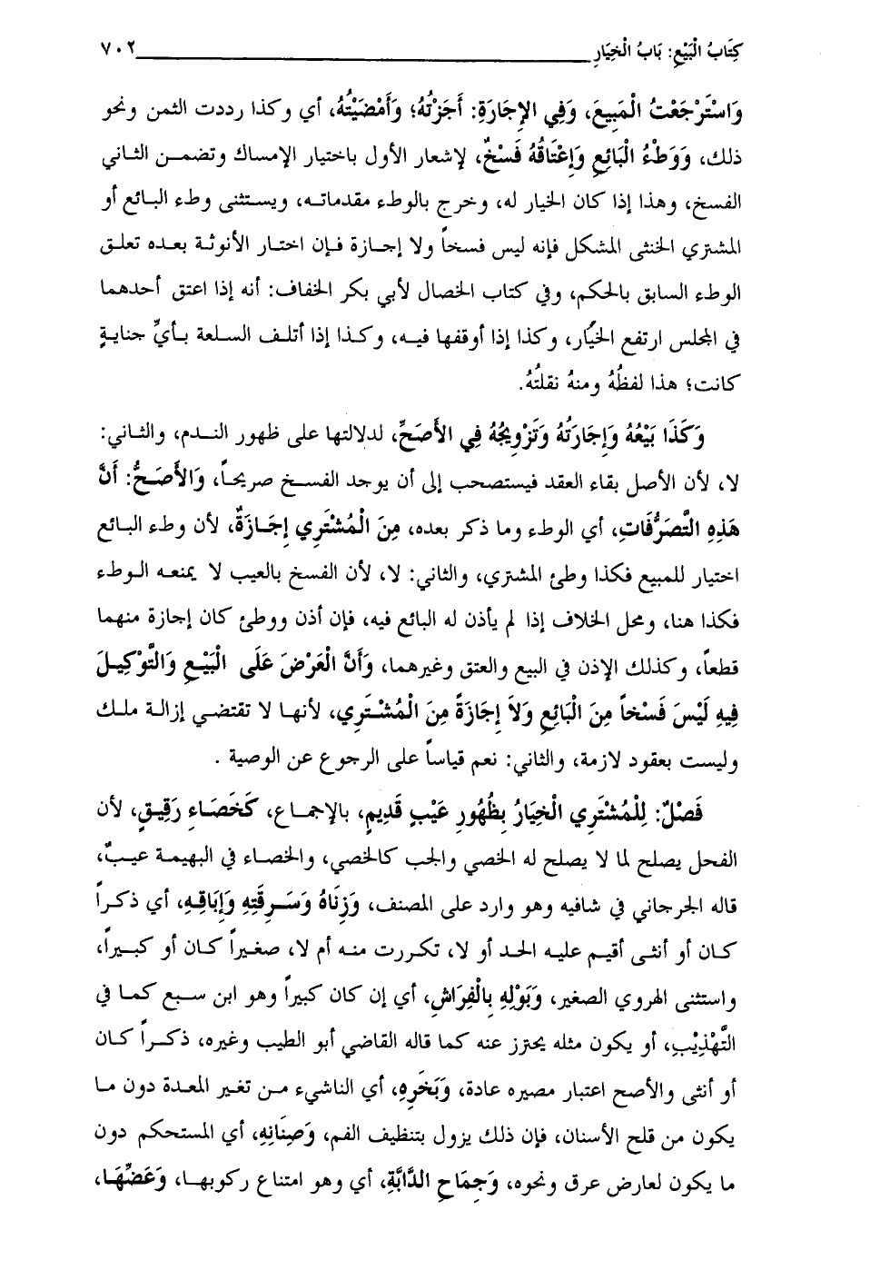 فَضلٌ: لِلْمُشْتَرِي الْخِيَارُ بِظُهُورِ عَيْبٍ قَدِيمٍ، بالإجماع، كَخَصَاءِ رَقِيقٍ، لأن الفعل يصلح لما لا يصلح له الخصي والجب كالخصي، والخصاء في البهيمة عيبٌ، قاله الجرجاني في شافيه وهو وارد على المصنف، وَزِنَاهُ وَسَرِقَتِهِ وَإبَاقِهِ، أي ذكرًا كان أو أنثى أقيم عليه الحد أو لا، تكررت منه أم لا، صغيرًا كان أو كبيرًا، واستثنى الهروي الصغر، وَبَوْلهِ بِالْفِرَاشِ، أي إن كان كبيرًا وهو ابن سبع كما في التهْذيبِ، أو يكون مثله يحترز عنه كما قاله القاضي أبو الطيب وغيره، ذكرًا كان أو أنثى والأصح اعتبار مصيره عادة، وَبَخَرِهِ، أي الناشئ من تغير العدة دون ما يكون من قلح الأسنان، فإن ذلك يزول بتنظيف الفم، وَصِنَانِهِ، أي المستحكم دون ما يكون لعارض عرق ونحوه، وَجِمَاحِ الدابةِ، أي وهو امتناع ركوبها، وَعَضِّها،