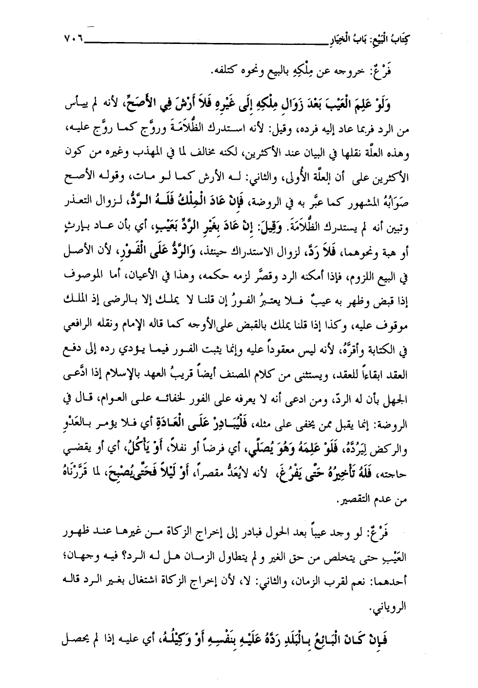 فَرْعٌ: لو وجد عيبًا بعد الحول فبادر إلى إخراج الزكاة من غيرها عند ظهور العَيْبِ حتى يتخلص من حق الغير ولم يتطاول الزمان هل له الرد؟ فيه وجهان؛ أحدهما: نعم لقرب الزمان، والثاني: لا، لأن إخراج الزكاة اشتغال بغير الرد قاله الرويانى.