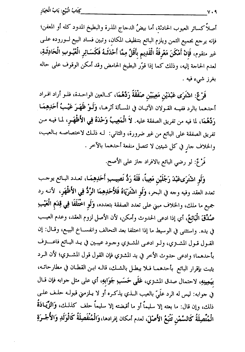 وَلَوِ اشْتَرَى عَبْدَ رَجُلَيْنِ مَعِيبًا، فَلَهُ رَدُّ نَصِيبِ أَحَدِهِمَا، تعدد البائع يوجب تعدد العقد وفيه وجه في البحر، وَلَوِ اشْتَرَيَاهُ فَلأحَدِهِمَا الرَّدُّ فِي الأَظْهَرِ، لأنه رد جميع ما ملك، والخلاف مبني على تعدد الصفقة بتعدده، وَلَوِ اخْتَلَفَا فِي قِدَمِ الْعَيْبِ صُدِّقَ الْبَائِعُ، أي إذا ادعى الحدوث وأمكن، لأن الأصل لزوم العقد، وعدم العيب في يده. واستثنى في الوسيط ما إذا اختلفا بعد التحالف وانفساخ البيع، وقال: إن القول قول المشتري، ولو ادعى المشتري وجود عيبين في يد البائع فاعترف بأحدهما؛ وادعى حدوث الأخر في يد المشتري فإن القول قول المشتري؛ لأن الرد يثبت بإقرار البائع بأحدهما فلا يبطل بالشك، قاله ابن القطان في مطارحاته، بِيَمِينِهِ، لاحتمال صدق المشتري، عَلَى حَسَبِ جوَابِهِ، أي على مثل جوابه فإن قال في جوابه: ليس له الرد علَيّ بالعيب الذي يذكره أو لا يلزمني قبوله حلف على ذلك، وإن قال: ما بعته إلا سليمًا أو ما أقبضته إلا سليمًا حلف كذلك، وَالزِّيَادَةُ الْمُتَّصِلَةُ كَالسَّمْنِ تَتْبَعُ الأَصْلَ، لعدم أمكان إفرادها، وَالْمُنْفَصِلَةُ كَالْوَلَدِ وَالأُجْرَةِ