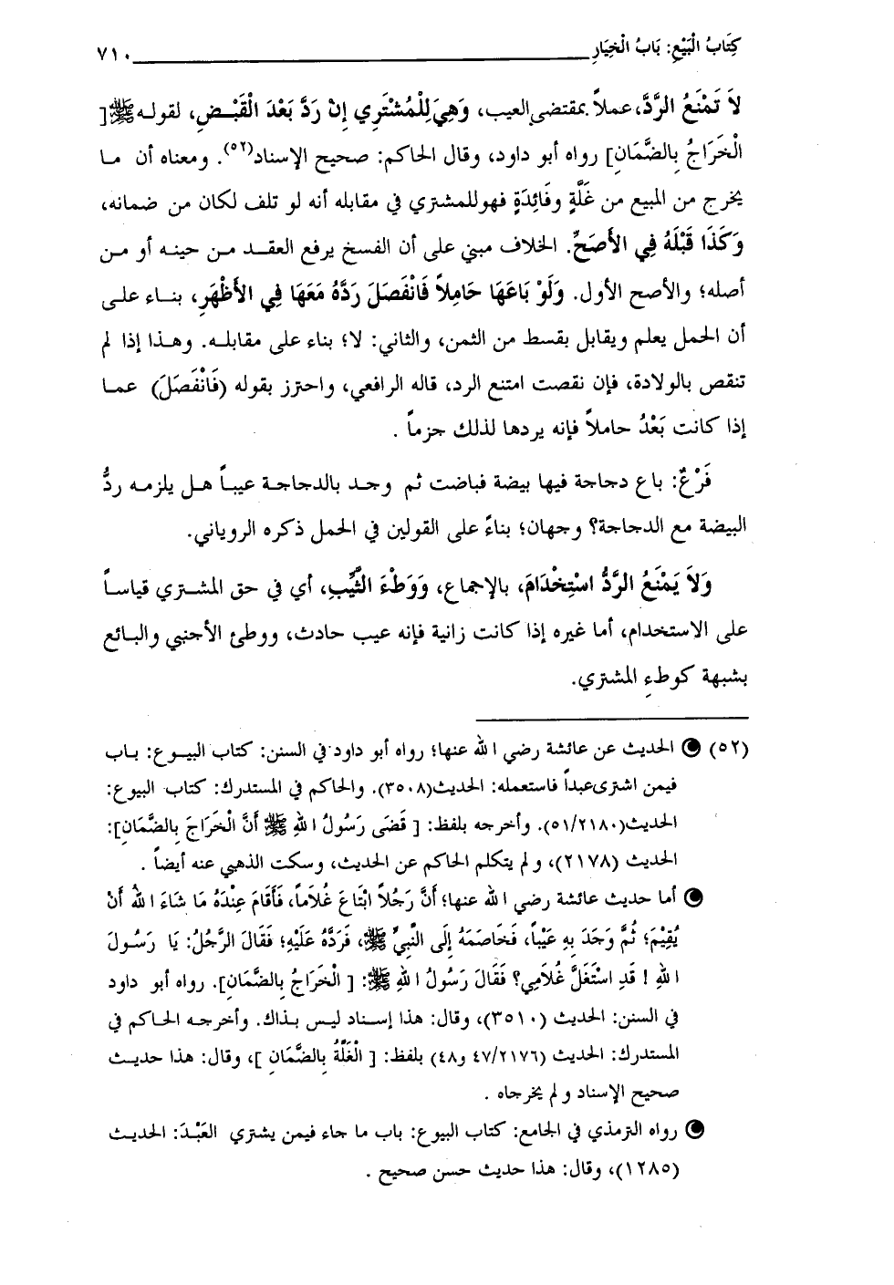 (¬52) • الحديث عن عائشة رضي الله عنها؛ رواه أبو داود في السنن: كتاب البيوع: باب فيمن اشترى عبدًا فاستعمله: الحديث (3508). والحاكم في المستدرك: كتاب- البيوع: الحديث (2180/ 51). وأخرجه بلفظ: [قَضَى رَسُولُ الله - صلى الله عليه وسلم - أَنَّ الْخَرَاجَ بالضَّمَانِ]: الحديث (2178)، ولم يتكلم الحاكم عن الحديث، وسكت الذهبي عنه أيضًا.