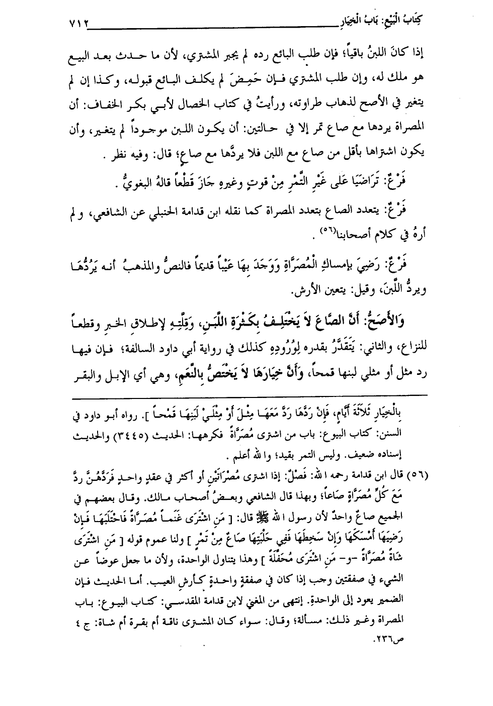 = بِالْخِيَارِ ثَلاَثَةَ أَيَّامٍ، فَإِنْ رَدَّهَا رَد مَعَهَا مِثْلَ أوْ مِثلَيْ لَبَنِهَا قَمْحًا]. رواه أبو داود في السنن: كتاب البيوع: باب من اشترى مُصَرَّاة فكرهها: الحديث (3445) والحديث إسناده ضعيف. وليس التمر بقيد؛ والله أعلم.