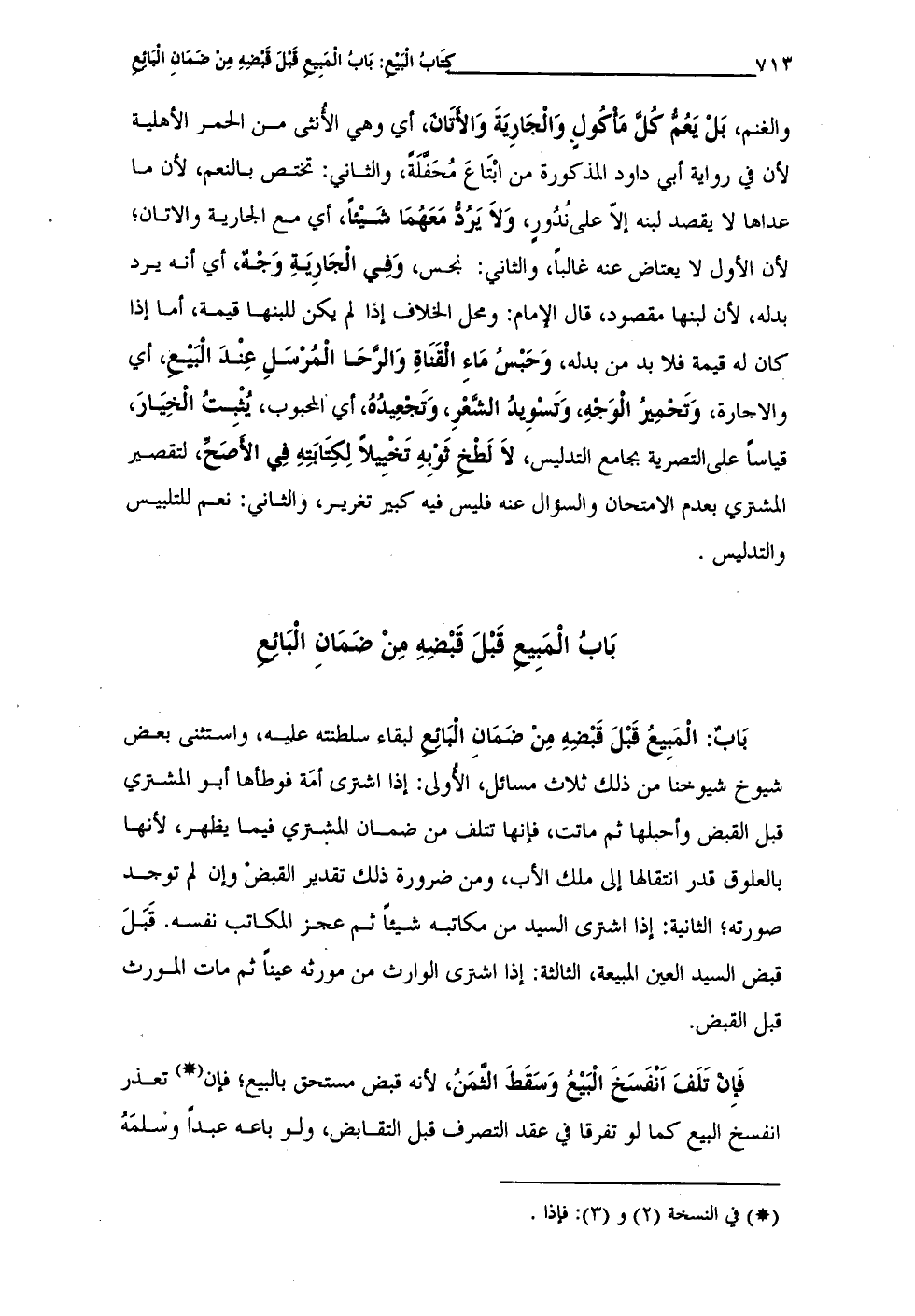 بَابٌ: الْمَبِيعُ قَبْلَ قَبْضِهِ مِنْ ضَمَانِ الْبَائِعِ لبقاء سلطنته عيه، واستثنى بعض شيوخ شيوخنا من ذلك ثلاث مسائل، الأُولى: إذا اشترى أمَة فوطأها أبو المشتري قبل القبض وأحبلها ثم ماتت، فإنها تتلف من ضمان المشتري فيما يظهر، لأنها بالعلوق قدر انتقالها إلى ملك الأب، ومن ضرورة ذلك تقدير القبضْ وإن لم توجد صورته؛ الثانية: إذا اشترى السيد من مكاتبه شيئًا ثم عجز المكاتب نفسه. قَبَلَ قبض السيد العين المبيعة، الثالثة: إذا اشترى الوارث من مورثه عينًا ثم مات المورث قبل القبض.