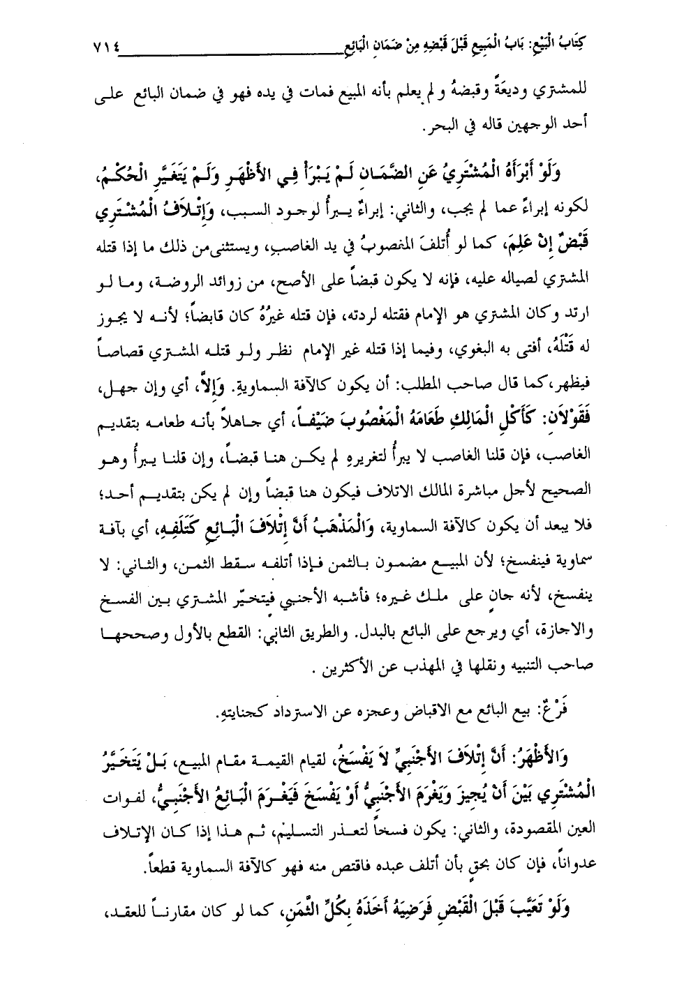 وَلَوْ أَبْرَأَهُ الْمُشترِيُ عَنِ الضَّمَانِ لَمْ يَبْرَأ فِي الأظْهَرِ وَلَمْ يَتَغَيَّرِ الْحُكْمُ، لكونه إبراءً عما لم يجب، والثاني: إبراءٌ يبرأُ لوجود السبب، وَإِتْلاَفُ الْمُشْتَرِي قَبْضٌ إِنْ عَلِمَ، كما لو أُتلفَ المغصوبُ في يد الغاصبِ، ويستثنى من ذلك ما إذا قتله المشتري لصياله عليه، فإنه لا يكون قبضًا على الأصح، من زوائد الروضة، وما لو ارتد وكان المشتري هو الإمام فقتله لردته، فإن قتله غيرُهُ كان قابضًا؛ لأنه لا يجوز له قَتْلَهُ، أفتى به البغوي، وفيما إذا قتله غير الإمام نظر ولو قتله المشتري قصاصًا فيظهر، كما قال صاحب المطلب: أن يكون كالآفة السماويةِ. وإلَّا، أي وإن جهل، فَقَوْلاَنِ: كَأَكلِ الْمَالِكِ طَعَامَهُ الْمَغْصُوبَ ضَيْفًا، أي جاهلًا بأنه طعامه بتقديم الغاصب، فإن قلنا الغاصب لا يبرأُ لتغريرهِ لم يكن هنا قبضًا، وإن قلنا يبرأُ وهو الصحيح لأجل مباشرة المالك الإتلاف فيكون هنا قبضًا وإن لم يكن بتقديم أحد؛ فلا يبعد أن يكون كالآفة السماوية، وَالْمَذْهَبُ أَنَّ إِتْلاَفَ البَائِع كَتَلَفِهِ، أي بآفة سماوية فينفسخ؛ لأن المبيع مضمون بالثمن فإذا أتلفه سقط الثمن، والثاني: لا ينفسخ، لأنه جانٍ على ملك غيره؛ فأشبه الأجنبي فيتخيّر المشتري بين الفسخ والإجازة، أي ويرجع على البائع بالبدل. والطريق الثاني: القطع بالأول وصححها صاحب التنبيه ونقلها في المهذب عن الأكثرين.