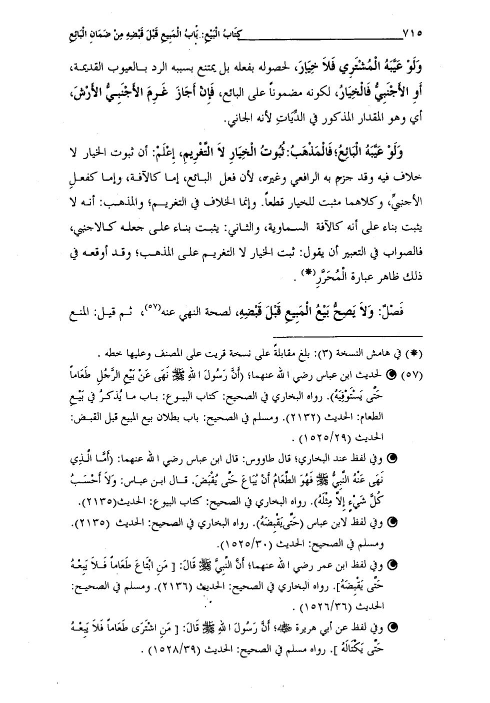 (¬57) • لحديث ابن عباس رضي الله عنهما؛ (أَنَّ رَسُولَ اللهِ - صلى الله عليه وسلم - نَهَى عَنْ بَيْع الرجُلِ طَعَامًا حَتى يَسْتَوْفِيَهُ). رواه البخاري في الصحيح: كتاب البيوع: باب ما يُذكرُ في بَيْع الطعام: الحديث (2132). ومسلم في الصحيح: باب بطلان بيع المبع قبل القبض: الحديث (29/ 1525).