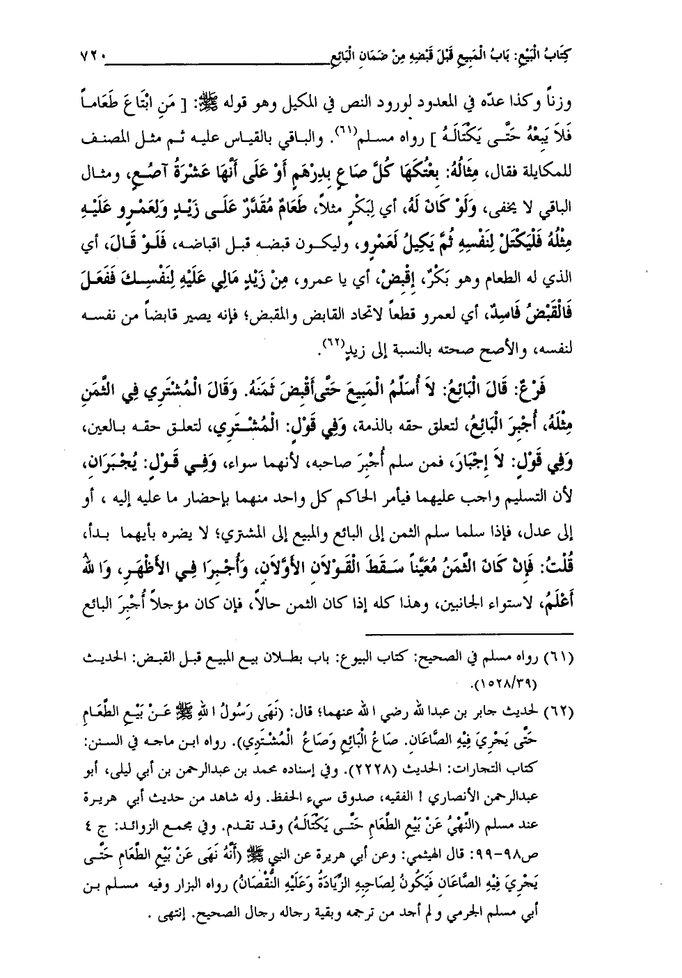 (¬62) لحديث جابر بن عبد الله رضي الله عنهما؛ قال: (نَهَى رَسُولُ اللهِ - صلى الله عليه وسلم - عَنْ بَيْع الطعَامِ حَتى يَجْرِيَ فِيْهِ الصَّاعَانِ. صَاعُ البَائِع وَصَاعُ المُشْتَرِي). رواه ابن ماجه في السنن: كتاب التجارات: الحديث (2228). وفي إسناده محمد بن عبد الرحمن بن أبى ليلى، أبو عبد الرحمن الأنصاري! الفقيه، صدوق سيء الحفظ. وله شاهد من حديث أبى هريرة عند مسلم (النَّهْيُ عَنْ بَيْع الطعَام حَتَّى يَكتالَهُ) وقد تقدم. وفي مجمع الزوائد: ج 4 ص 98 - 99: قال الهيثمى: وعن أبي هريرة عن النبي - صلى الله عليه وسلم - (أنَّهُ نَهَى عَنْ بَيْع الطعَامِ حَتى يَجْرِيَ فِيهِ الصَّاعَانِ فَيَكونُ لِصَاحِبِهِ الزِّيَادَة وَعَلَيهِ النُّقْصَانُ) رواه البزار وفيه مسلم بن أبى مسلم الجرمى ولم أجد من ترجمه وبقية رجاله رجال الصحيح. انتهى.