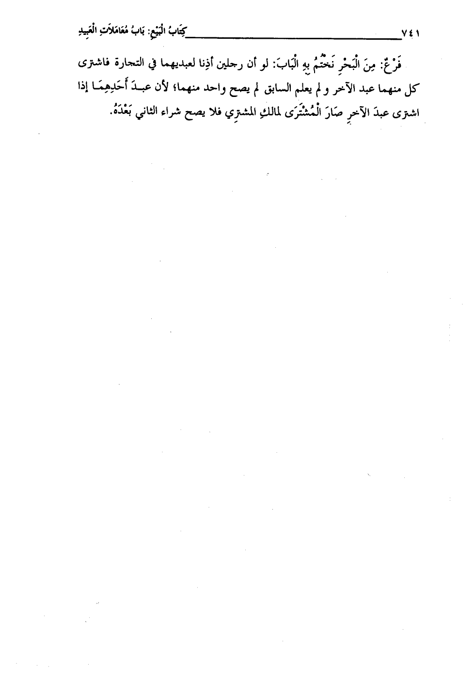 فَرْعٌ: مِنَ الْبَحْرِ نَخْتُمُ بهِ الْبَابَ: لو أن رجلين أذِنا لعبديهما في التجارة فاشترى كل منهما عبد الآخر ولم يعلم السابق لم يصح واحد منهما؛ لأن عبدَ أَحَدِهِمَا إذا اشترى عبدَ الآخرِ صَارَ الْمُشْتَرَى لمالكِ المشترِى فلا يصح شراء الثاني بَعْدَهُ.