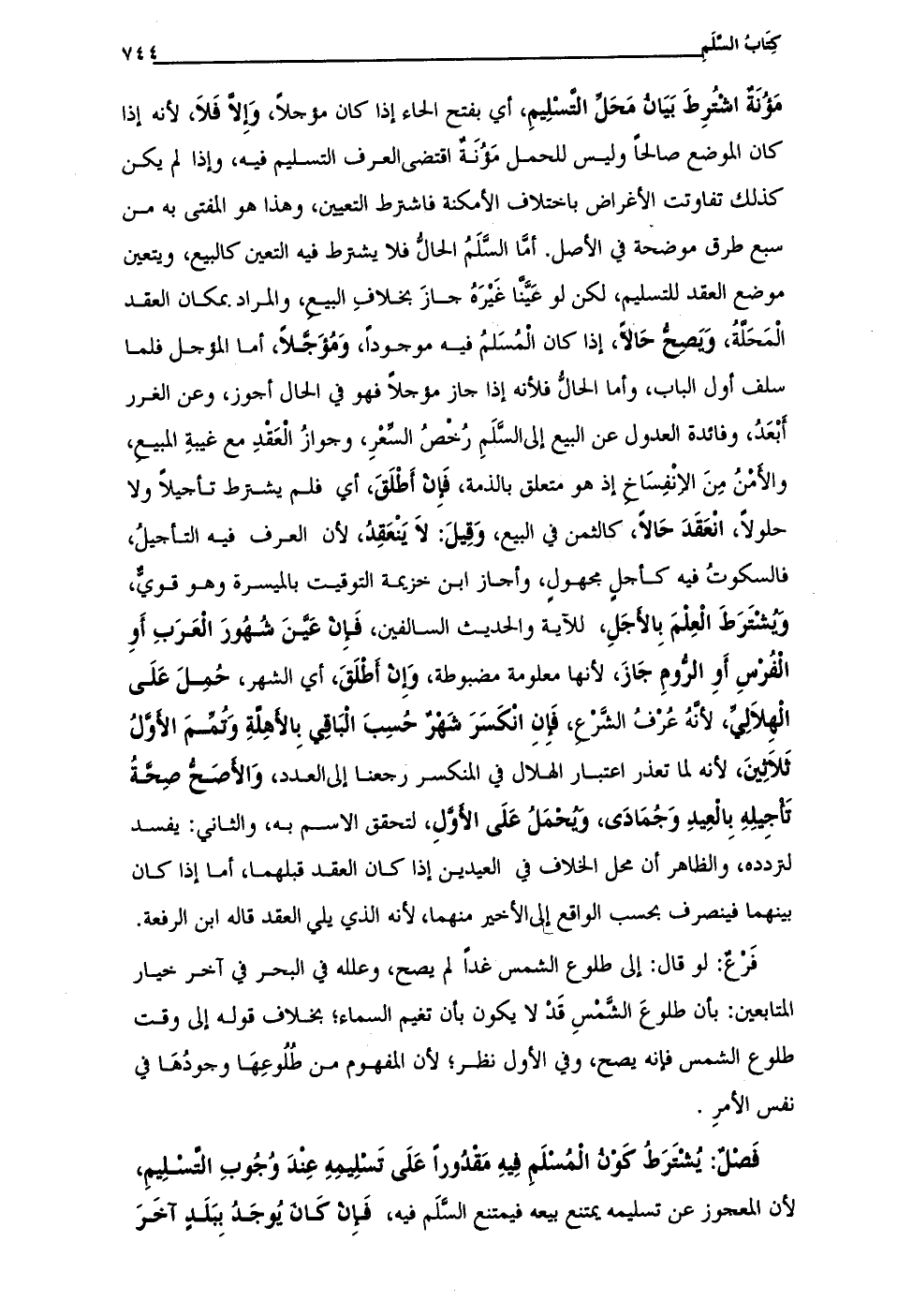 مَؤُنَة اشْتُرِطَ بَيَان مَحَل التسْلِيمِ، أي بفتح الحاء إذا كان مؤجلًا، وِإلا فَلاَ, لأنه إذا كان الموضع صالحًا وليس للحمل مَوُنَةٌ اقتضى العرف التسليم فيه، وإذا لم يكن كذلك تفاوتت الأغراض باختلاف الأمكنة فاشترط التعيين، وهذا هو المفتى به من سبع طرق موضحة في الأصل. أما السَّلَمُ الحالُّ فلا يشترط فيه التعين كالبيع، ويتعين موضع العقد للتسليم، لكن لو عَيَّنًا غَيْرَهُ جازَ بخلافِ البيع، والمراد بمكان العقد الْمَحَلَّةُ، وَيصِحُّ حَالًا، إذا كان المُسَلمُ فيه موجودًا، وَمُؤَجَّلًا، أما المؤجل فلما سلف أول الباب، وأما الحالُّ فلأنه إذا جاز مؤجلًا فهو في الحال أجوز، وعن الغرر أبْعَدُ، وفائدة العدول عن البيع إلى السَّلَمِ رُخْصُ السِّعْرِ، وجوازُ العَقْدِ مع غيبهِ المبيع، والأمْنُ مِنَ الانْفِسَاخ إذ هو متعلق بالذمة، فَإِنْ أَطْلَقَ، أي فلم يشترط تأجيلًا ولا حلولًا، انعَقَدَ حَالًا، كالثمن في البيع، وَقِيلَ: لاَ يَنْعَقدُ, لأن العرف فيه التأجيلُ، فالسكوتُ فيه كأجلٍ مجهولٍ، وأجاز ابن خزيمة التوقيت بالميسرة وهو قويٌّ، ويُشْتَرَطَ الْعِلمَ بِالأجَلِ، للآية والحديث السالفين، فَاِن عَينَ شُهُورَ الْعَرَبِ أَوِ الْفُرسِ أَوِ الرُّومِ جَازَ, لأنها معلومة مضبوطة، وِإن أطْلَقَ، أي الشهر، حُمِلَ عَلَى الْهِلاَلِيِّ, لأنهُ عُرفُ الشَّرْع، فإنِ انْكسَرَ شهرٌ حُسِبَ الباقِي بالأهلةِ وَتمِّمَ الأوَّلُ ثلاثينَ, لأنه لما تعذر اعتبار الهلال في المنكسر رجعنا إلى العدد، وَالأصَحُّ صِحَّةُ تأجِيلِهِ بِالعِيدِ وَجُمَادَى، ويحمَلُ عَلَى الأولِ، لتحقق الاسم به، والثاني: يفسد لتردده، والظاهر أن محل الخلاف في العيدين إذا كان العقد قبلهما، أما إذا كان بينهما فينصرف بحسب الواقع إلى الأخير منهما, لأنه الذي يلي العقد قاله ابن الرفعة.