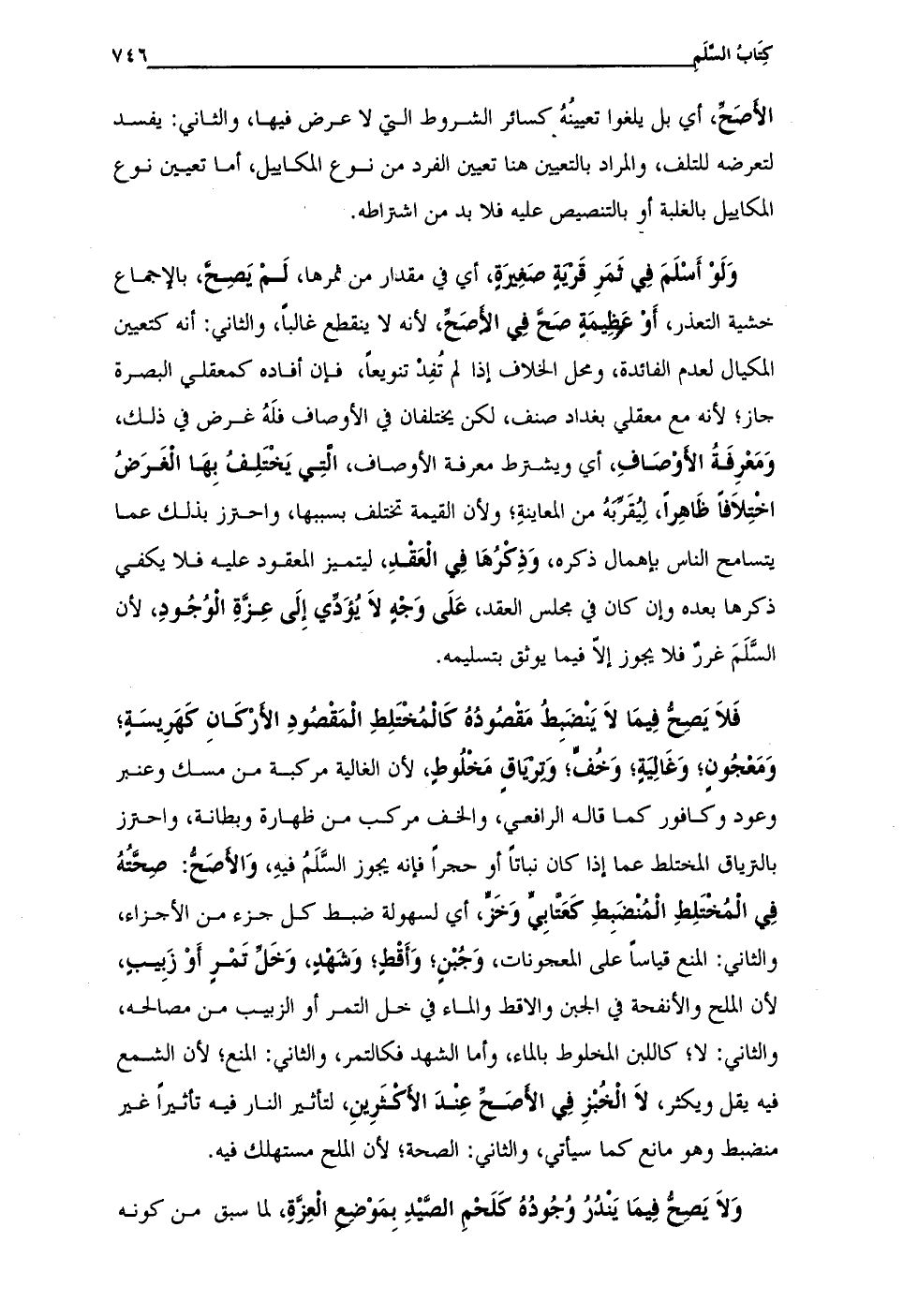 فَلاَ يَصِحُّ فِيمَا لاَ يَنْضَبِطُ مَقْصُودُهُ كاَلمُخْتَلِطِ الْمَقْصُودِ الأرْكانِ كَهَرِيسَةِ؛ وَمَعْجُونٍ، وَغَالِيَة؛ وَخُفٍّ؛ وَترياقٍ مَخْلُوطٍ؛ لأن الغالية مركبة من مسك وعنبر وعود وكافور كما قاله الرافعي، والخف مركب من ظهارة وبطانة، واحترز بالترياق المختلط عما إذا كان نباتًا أو حجرًا فإنه يجوز السَّلَمُ فيهِ، وَالأصَحُّ: صِحتُهُ في المُختَلِطِ الْمُنْضبِطِ كَعَتابِيٍّ وَخَزّ، أي لسهولة ضبط كل جزء من الأجزاء، والثانى: المنع قياسًا على المعجونات، وَجُبْنٍ؛ وَأَقْطٍ؛ وَشَهْدٍ، وَخَلِّ تَمْرٍ أَوْ زَبِيبٍ، لأن الملح والأنفحة في الجبن والاقط والماء في خل التمر أو الزبيب من مصالحه، والثانى: لا؛ كاللبن المخلوط بالماء، وأما الشهد فكالتمر، والثاني: المنع؛ لأن الشمع فيه يقل ويكثر، لاَ الْخُبْزِ في الأصَحِّ عِنْدَ الأكْثَرِينِ، لتأثير النار فيه تاثيرًا غير منضبط وهو مانع كما سيأتى، والثانى: الصحة؛ لأن الملح مستهلك فيه.