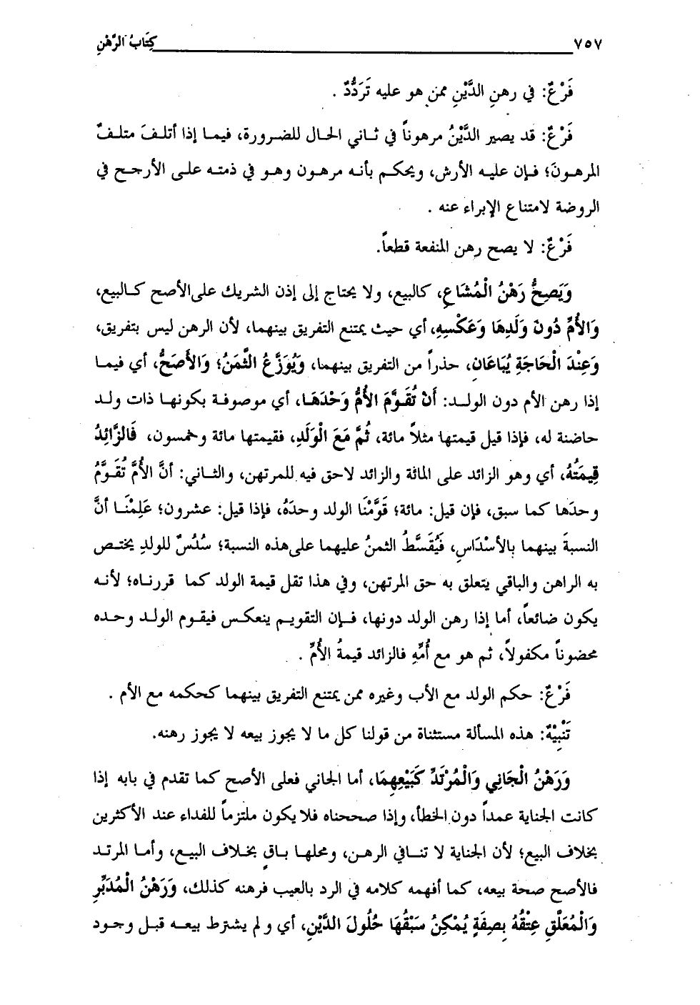وَيَصِحُّ رَهْنُ الْمُشَاع، كالبيع، ولا يحتاج إلى إذن الشريك على الأصح كالبيع، وَالأُمِّ دُونَ وَلَدِهَا وَعَكْسِهِ، أي حيث يمتنع التفريق بينهما, لأن الرهن ليس بتفريق، وَعِنْدَ الْحَاجَةِ يُبَاعَانِ، حذرًا من التفريق بينهما، وَيُوَزَّعُ الثِّمَنُ؛ وَالأَصَحُّ، أي فيما إذا رهن الأم دون الولد: أَنْ تُقَومَ الأُمُّ وَحْدَهَا، أي موصوفة بكونها ذات ولد حاضنة له، فإذا قيل قيمتها مثلًا مائة، ثُمَّ مَعَ الْوَلَدِ، فقيمتها مائة وخمسون، فَالزَّائِدُ قِيمَتُهُ، أي وهو الزائد على المائة والزائد لاحق فيه للمرتهن، والثاني: أنَّ الأُمَّ تُقَوَّمُ وحدَها كما سبق، فإن قيل: مائة؛ قَوَّمْنَا الولد وحدَهُ، فإذا قيل: عشرون؛ عَلِمْنَا أنَّ النسبةَ بينهما بالأسْدَاسِ، فَيُقَسَّطُ الثمنُ عليهما على هذه النسبة؛ سُدُسٌ للولدِ يختص به الراهن والباقي يتعلق به حق المرتهن، وفي هذا تقل قيمة الولد كما قررناه؛ لأنه يكون ضائعًا، أما إذا رهن الولد دونها، فإن التقويم ينعكس فيقوم الولد وحده محضونًا مكفولًا، ثم هو مع أُمِّهِ فالزائد قيمةُ الأُمِّ.