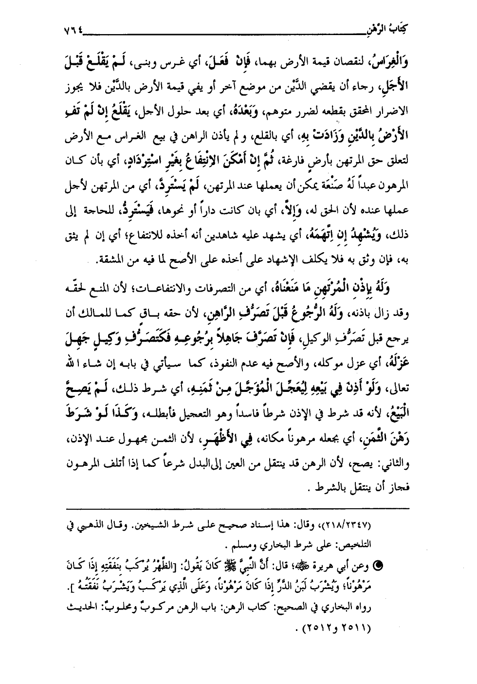 • وعن أبي هريرة - رضي الله عنه -؛ قال: أن النبي - صلى الله عليه وسلم - كَانَ يَقُولُ: [الظَّهْرُ يُرْكَبُ بِنَفَقَتِهِ إِذَا كَانَ مَرهُوْنًا؛ وَيُشْرَبُ لَبَنُ الدَّرِّ إِذَا كَانَ مَرْهُوْنًا، وَعَلَى الَّذِي يَرْكَبُ وَيَشْرَبُ نفَقتُهُ]. رواه البخاري في الصحيح: كتاب الرهن: باب الرهن مركوبٌ ومحلوبٌ: الحديث (2511 و 2512).