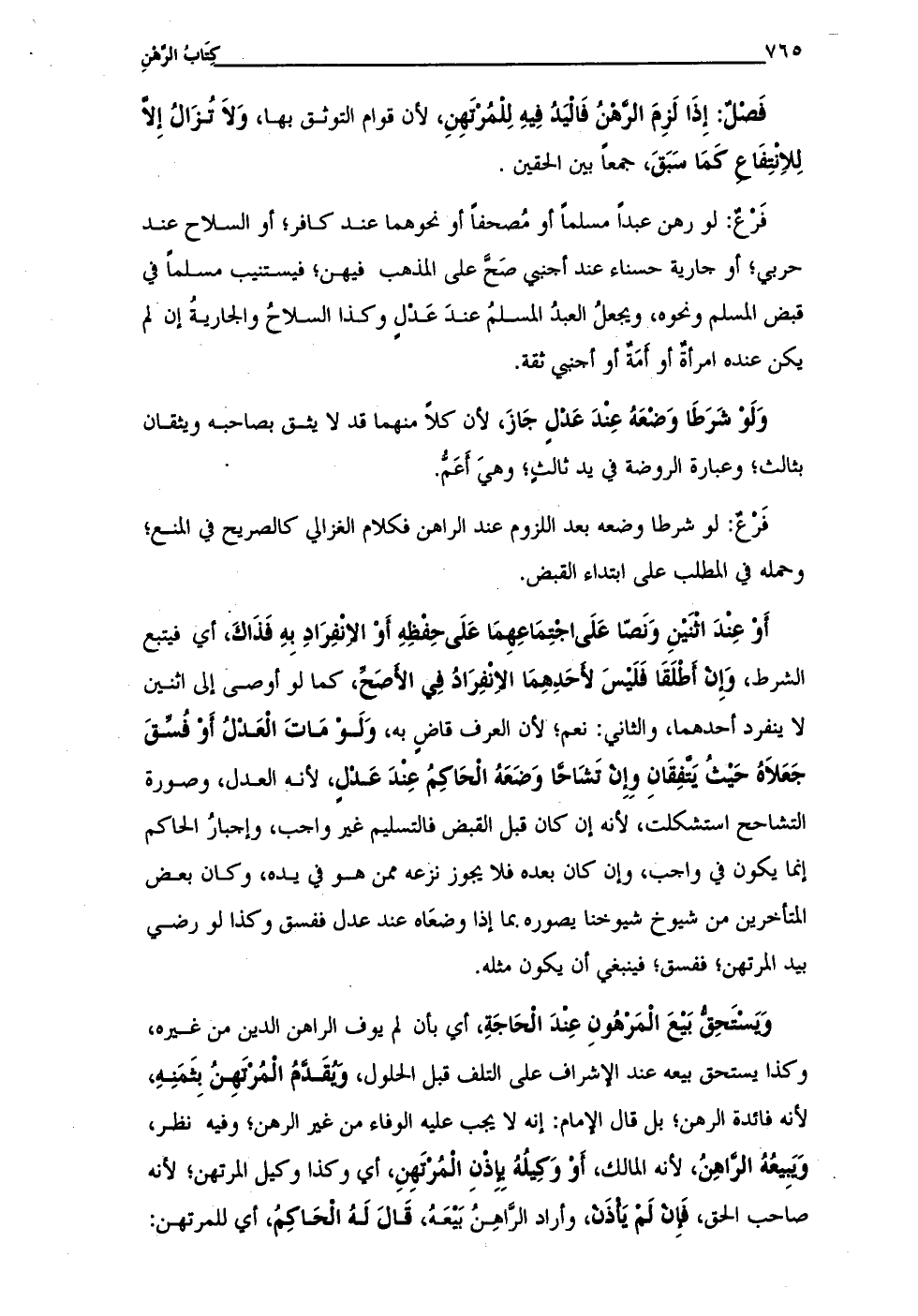 فَرْعٌ: لو رهن عبدًا مسلمًا أو مُصحفًا أو نحوهما عند كافر؛ أو السلاح عند حربي؛ أو جارية حسناء عند أجنبي صَحَّ على المذهب فيهن؛ فيستنيب مسلمًا في قبض المسلم ونحوه، ويجعلُ العبدُ المسلمُ عندَ عَدْلٍ وكذا السلاحُ والجاريةُ إن لم يكن عنده امرأةٌ أو أمَةٌ أو أجنبي ثقة.