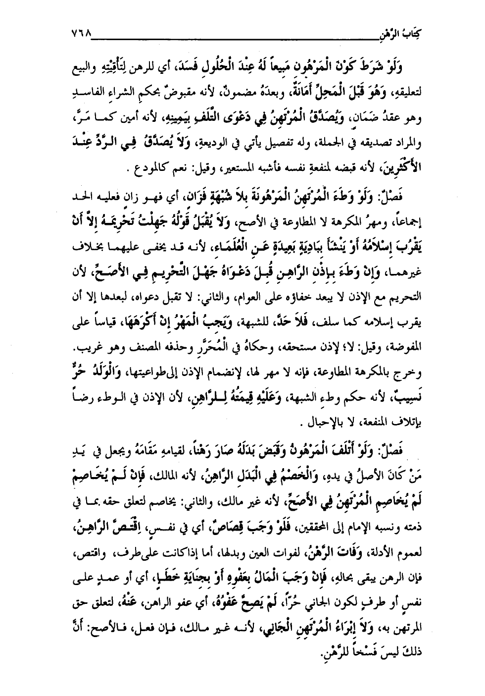 فَصْلٌ: وَلَوْ وَطَءِ المُرْتَهِنُ المَرْهُونَةَ بِلاَ شُبْهَةٍ فَزَانٍ، أي فهو زانٍ فعليه الحد إجماعًا، ومهرُ المكرهة لا المطاوعة في الأصح، وَلاَ يُقْبَلُ قَوْلُهُ جَهِلْتُ تَحْرِيمَهُ إِلَّا أَن يَقْرُبَ إِسْلاَمُهُ أَوْ يَنشَأَ بِبَادِيَةٍ بَعِيدَةٍ عَنِ الْعُلَمَاءِ، لأنه قد يخفى عليهما بخلاف غيرهما، وَإِنْ وَطَءَ بِإِذْنِ الرَّاهِنِ قُبِلَ دَعْوَاهُ جَهْلَ التْحْرِيمِ فِي الأَصَحِّ، لأن التحريم مع الإذن لا يبعد خفاؤه على العوام، والثاني: لا تقبل دعواه، لبعدها إلا أن يقرب إسلامه كما سلف، فَلاَ حَدَّ، للشبهة، وُيجِبُ الْمَهْرُ إِن أَكْرَهَهَا، قياسًا على المفوضة، وقيل: لا؛ لإذن مستحقه، وحكاهُ في الْمُحَرَّرِ وحذفه المصنف وهو غريب. وخرج بالمكرهة المطاوعة، فإنه لا مهر لها، لإنضمام الإذن إلى طواعيتها، وَالْوَلَدُ حُرٌّ نَسِيبٌ، لأنه حكم وطءِ الشبهة، وَعَلَيهِ قِيمَتُهُ لِلرَّاهِنِ، لأن الإذن في الوطء رضًا بإتلاف المنفعة، لا بالإحبال.