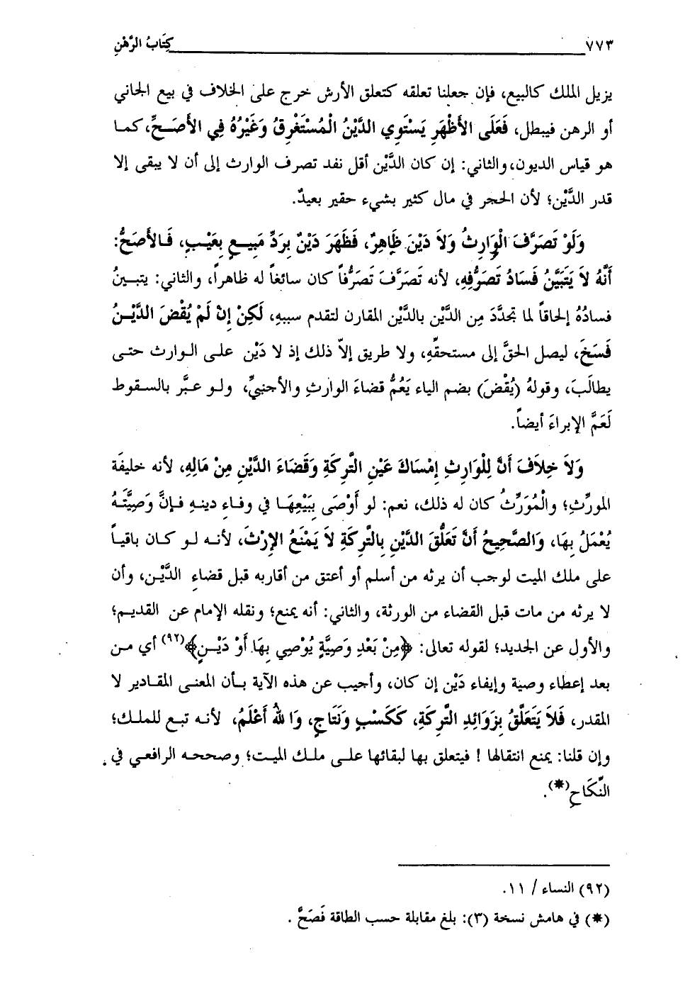 وَلاَ خِلاَفَ أَن لِلْوَارِثِ إِمْسَاكَ عَينِ التَّرِكَةِ وَقَضَاءَ الدَّيْنِ مِنْ مَالِهِ، لأنه خليفَة المورِّثِ؛ والْمُوَرِّثُ كان له ذلك، نعم: لو أَوْصَى بِبَيْعِهَا في وفاءِ دينهِ فإنَّ وَصِيَّتَهُ يُعْمَلُ بِهَا، وَالصَّحِيحُ أَنَّ تَعَلُّقَ الدَّيْنِ بِالتَّرِكَةِ لاَ يَمْنَعُ الإِرْثَ، لأنه لو كان باقيًا على ملك الميت لوجب أن يرثه من أسلم أو أعتق من أقاربه قبل قضاءِ الدَّيْن، وأن لا يرثه من مات قبل القضاء من الورثة، والثاني: أنه يمنع؛ ونقله الإمام عن القديم؛ والأول عن الجديد؛ لقوله تعالى: {مِنْ بَعْدِ وَصِيَّةٍ يُوصِي بِهَا أَوْ دَيْنٍ} (¬92) أي من بعد إعطاء وصية وإيفاء دَيْن إن كان، وأجيب عن هذه الآية بأن المعنى المقادير لا المقدر، فَلاَ يَتَعَلَّقُ بِزَوَائِدِ التَّرِكَةِ، كَكَسْبٍ وَنَتَاجٍ، وَاللهُ أَعْلَمُ، لأنه تبع للملك؛ وإن قلنا: يمنع انتقالها! فيتعلق بها لبقائها على ملك الميت؛ وصححه الرافعي في النِّكَاحِ (•).