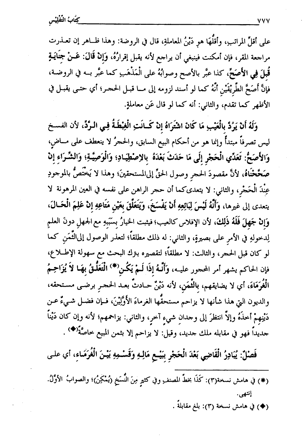 وَلَهُ أَن يَرُد بالعَيبِ مَا كان اشتَرَاهُ إِن كَانَتِ الغِبطَةُ فِي الرَّدِّ، لأنَّ الفسخ ليس تصرفًا مبتدأ وإنَّما هو من أحكام البيع السابق، والحجرُ لا ينعطف على ماضٍ، وَالأصَح: تعدِّي الحَجرِ إِلَى مَا حَدَثَ بَعْدَهُ بِالاصطِيَادِ؛ وَالْوَصيةِ؛ وَالشِّرَاءِ إِن صَححْنَاهُ، لأنَّ مقصودَ الحجرِ وصول الحق إلى المستحقينَ؛ وهذا لا يَختصُّ بالموجودِ عِنْدَ الحَجرِ، والثاني: لا يتعدى كما أن حجر الراهن على نفسه في العين المرهونة لا يتعدى إلى غيرها، وَأنهُ لَيسَ لِبَائِعِهِ أن يَفْسَخَ، ويتَعَلقَ بِعَيْنِ مَتَاعِهِ إِن عَلِمَ الحَالَ، وَإِن جَهِلَ فَلَهُ ذَلِكَ، لأنَّ الإفلاس كالعيب؛ فيثبت الخيارُ بِسَبَبِهِ مع الجهلِ دونَ العلمِ لِدخولهِ في الأمرِ على بصيرةٍ، والثاني: له ذلك مطلقًا؛ لتعذر الوصول إلى الثمَنِ كما لو كان قبل الحجر، والثالث: لا مطلقًا؛ لتقصيره بترك البحث مع سهولة الإطلاع، فإن الحاكم يشهر أمر المحجور عليه، وَأنهُ إِذَا لَمْ يَكنِ (•) التَعَلُّقُ بِهَا لاَ يُزَاحِمُ الْغُرَمَاءَ، أي لا يضايقهم، بِالثمَنِ، لأنَّه دَيْن حادث بعد الحجرِ برضى مستحقه، والديون التي هذا شأنها لا يزاحم مستحقها الغرماءَ الأوَّلِينَ، فإن فضل شيء عن دَينهِمْ أخذَهُ وإلَّا انتظرَ إلى وجدانِ شيءٍ آخرٍ، والثاني: يزاحمهم؛ لأنَّه وإن كان دَيْنًا جديدًا فهو في مقابله ملك جديد، وقيل: لا يزاحم إلَّا بثمن المبيع خاصَّة (•).