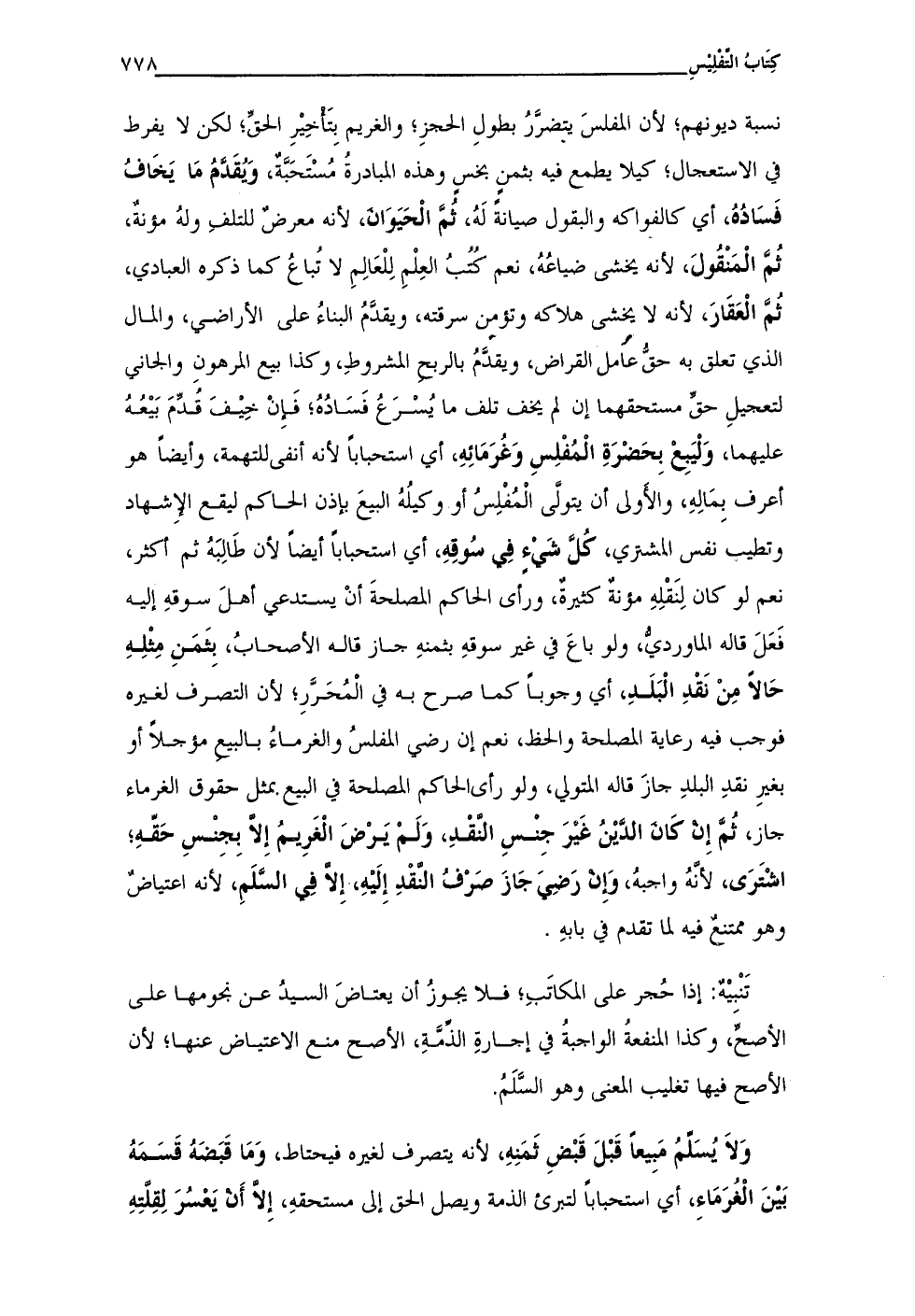 نسبة ديونهم؛ لأنَّ المفلسَ يتضرَّرُ بطولِ الحجزِ؛ والغريم بِتَأخِيْرِ الحقِّ؛ لكن لا يفرط في الاستعجال؛ كيلا يطمع فيه بثمنٍ بخسٍ وهذه المبادرةُ مُسْتَحَبَّة، وَيُقَدَّمُ مَا يَخَافُ فَسَادُهُ، أي كالفواكه والبقول صيانةً لَهُ، ثُمَّ الْحَيَوَان، لأنَّه معرضٌ للتلفِ ولهُ مؤنةٌ، ثُمُّ الْمَنْقُول، لأنَّه يخشى ضياعُهُ، نعم كُتُبُ العِلْمِ لِلْعَالِمِ لا تُباعُ كما ذكره العبادي، ثُمَّ الْعَقارَ، لأنَّه لا يخشى هلاكه وتؤمن سرقته، ويقدمُ البناءُ على الأراضي، والمال الذي تعلق به حقُّ عامل القراض، ويقدَّمُ بالربح المشروطِ، وكذا بيع المرهونِ والجانى لتعجيلِ حقِّ مستحقهما إن لم يخف تلف ما يُسْرَعُ فَسَادُهُ؛ فَإنْ خِيْفَ قُدِّمَ بَيْعُهُ عليهما، وَلْيَبِعْ بِحَضْرَةِ الْمُفْلِسِ وَغُرَمَائِهِ، أي استحبابًا لأنَّه أنفى للتهمة، وأيضًا هو أعرف بِمَالِهِ، والأولى أن يتولى الْمُفْلِسُ أو وكيلُهُ البيعَ بإذن الحاكم ليقع الإشهاد وتطيب نفس المشتري، كُل شَيءٍ فِي سوقِهِ، أي استحبابًا أيضًا لأن طَالِبَهُ ثم أكثر، نعم لو كان لِنَقْلِهِ مؤنة كثيرة، ورأى الحاكم المصلحةَ أنْ يستدعى أهلَ سوقهِ إليه فَعَلَ قاله الماورديُّ، ولو باعَ في غير سوقهِ بثمنهِ جاز قاله الأصحابُ، بِثَمَنِ مِثْلِهِ حَالًا مِنْ نَقْدِ الْبَلَدِ، أي وجوبًا كما صرح به في الْمُحَرر؛ لأنَّ التصرف لغيره فوجب فيه رعاية المصلحة والحظ، نعم إن رضي المفلس والغرماءُ بالبيع مؤجلًا أو بغيرِ نقدِ البلدِ جازَ قاله المتولي، ولو رأى الحاكم المصلحة في البيع بمثل حقوق الغرماء جاز، ثُمَّ إِن كَان الدَّيْنُ غَيرَ جِنْسِ النقْدِ، وَلَمْ يَرْضَ الْغَرِيمُ إِلَّا بِجِنْس حَقّهِ؛ اشْتَرَى، لأنهُ واجبهُ، وِإن رَضِيَ جَازَ صَرْف النقدِ إِلَيْهِ، إِلَّا فِي السَّلمِ، لأنَّه اعتياضٌ وهو ممتنعٌ فيه لما تقدم في بابهِ.