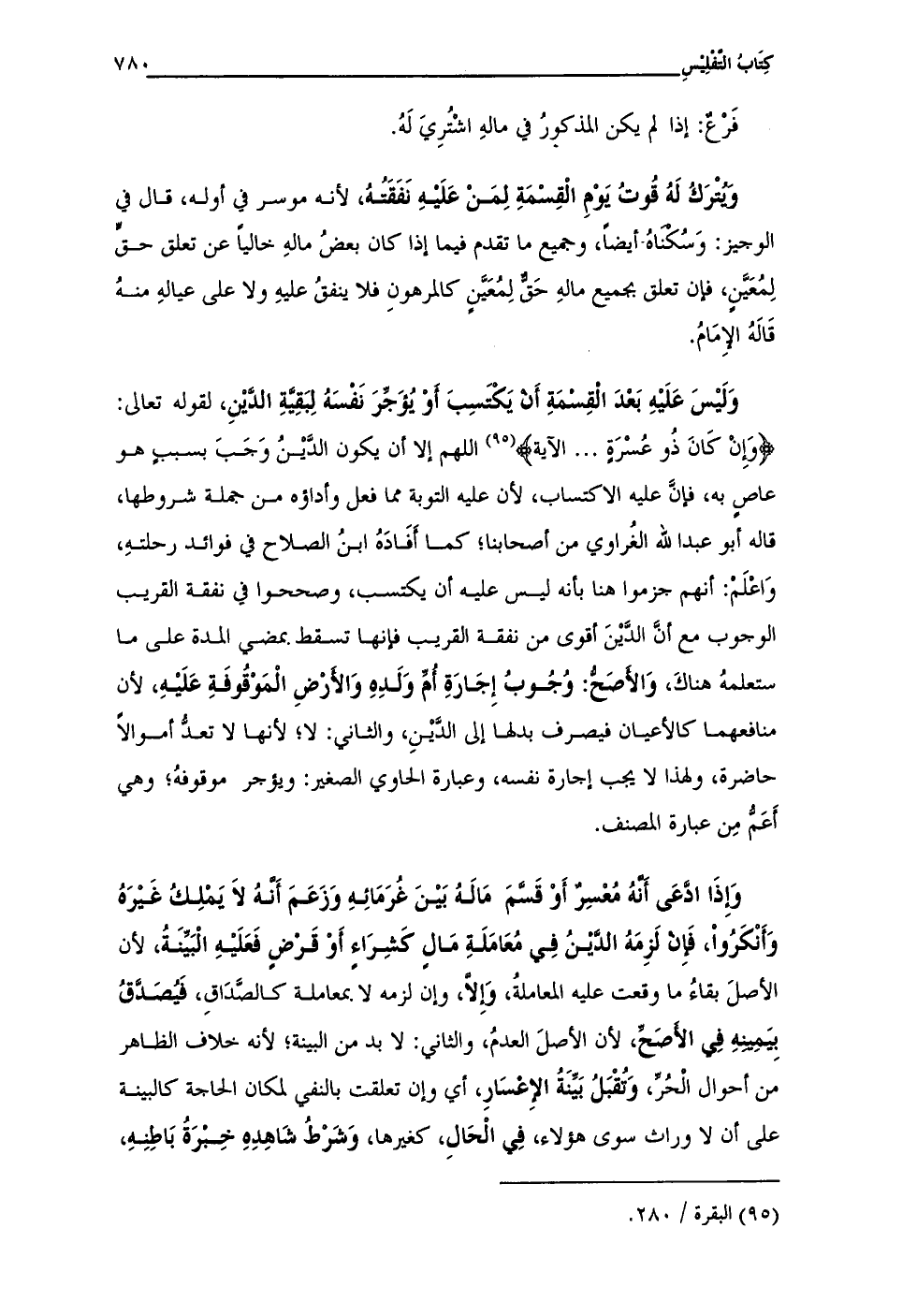 وَلَيْسَ عَلَيْهِ بَعْدَ القسمَةِ أَن يَكْتَسِبَ أوْ يُؤَجِّرَ نَفْسَهُ لِبَقِيةِ الديْنِ، لقوله تعالى: {وَإِنْ كَانَ ذُو عُسْرَةٍ ... الآية} (¬95) اللَّهم إلَّا أن يكون الدَّيْنُ وَجَبَ بسببٍ هو عاصٍ به، فإن عليه الاكتساب، لأنَّ عليه التوبة ممَّا فعل وأداؤه من جملة شروطها، قاله أبو عبد الله الغُراوي من أصحابنا؛ كما أفَادَهُ ابنُ الصلاح في فوائد رحلتهِ، وَاعْلَم: أنهم جزموا هنا بأنه ليس عليه أن يكتسب، وصححوا في نفقة القريب الوجوب مع أنَّ الدَّيْنَ أقوى من نفقة القريب فإنها تسقط بمضى المدة على ما ستعلمهُ هناكَ، وَالأصَح: وُجُوبُ إِجَارَةِ أمّ وَلَدِهِ وَالأرْضِ الْمَوْقُوفةِ عَلَيْهِ، لأنَّ منافعهما كالأعيان فيصرف بدلها إلى الدَّيْنِ، والثاني: لا؛ لأنها لا تعدُّ أموالًا حاضرة، ولهذا لا يجب إجارة نفسه، وعبارة الحاوي الصَّغير: ويؤجر موقوفهُ؛ وهي أَعَمُّ مِن عبارة المصنف.