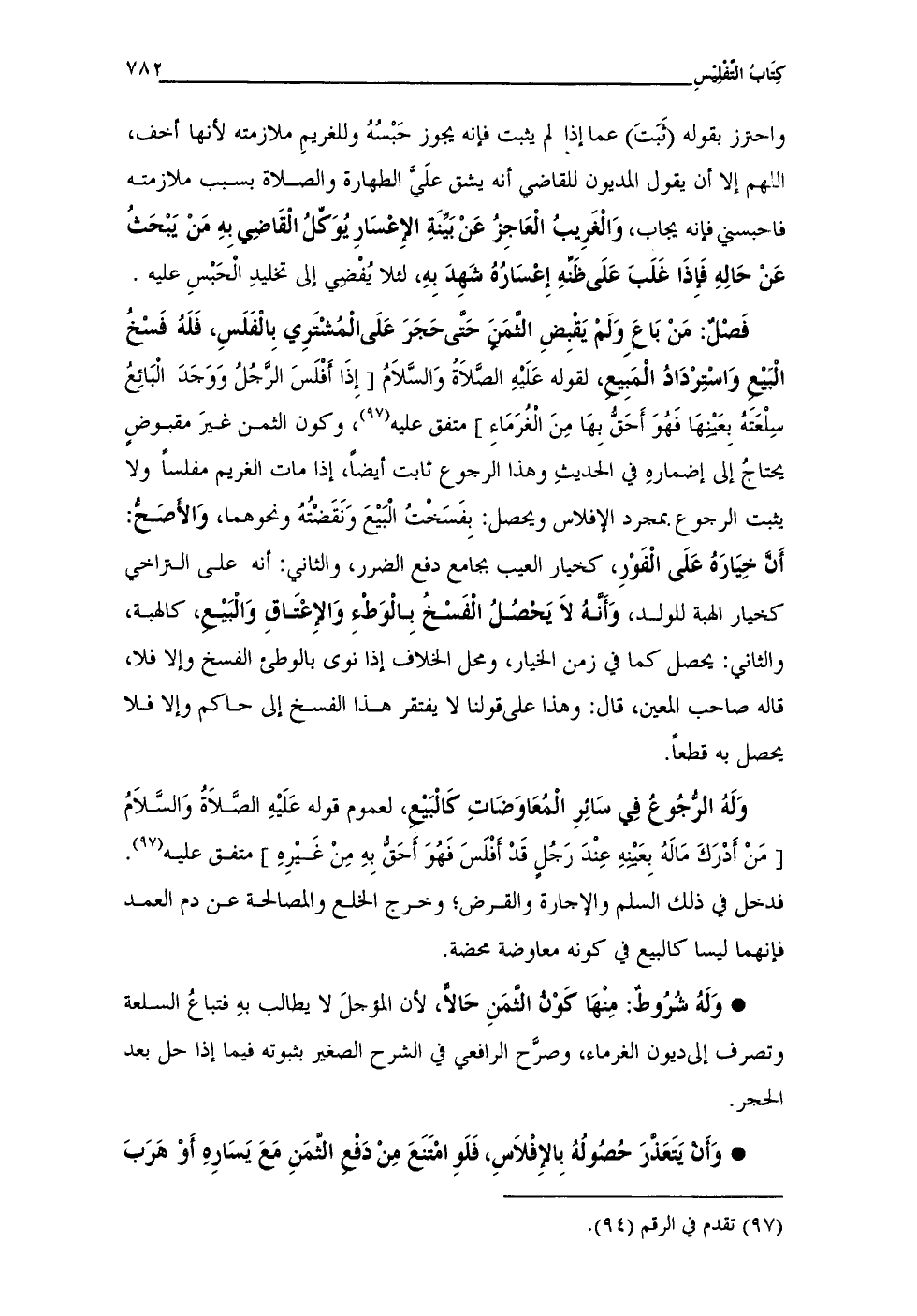 فَصْلٌ: مَنْ بَاعَ وَلَمْ يَقْبِضِ الثَّمنِ حَتَّى حَجَرَ عَلَى الْمُشْتَرِي بِالْفَلَسِ، فَلَهُ فَسْخُ الْبيْعِ وَاسْتِرْدَادُ الْمَبِيع، لقوله عَلَيْهِ الصَّلاَةُ وَالسَّلاَمُ [إِذَا أَفْلَسَ الرَّجُلُ وَوَجَدَ الْبَائعُ سِلعتهُ بِعَيْنهَا فَهُوَ أَحَقُّ بِهَا مِنَ الْغُرَمَاءِ] متَّفقٌ عليه (97)، وكون الثمن غيرَ مقبوضٍ يحتاجُ إلى إضمارهِ في الحديثِ وبهذا الرجوع ثابت أيضًا، إذا مات الغريم مفلسًا ولا يثبت الرجوع بمجرد الإفلاس ويحصل: بِفَسَخْتُ الْبَيْعَ وَنَقَضْتُهُ ونحوهما، وَالأصَحُّ: أَنَّ خِيَارَهُ عَلَى الْفَوْرِ، كخيار العيب بجامع دفع الضرر، والثاني: أنَّه على التراخي كخيار الهبة للولد، وَأَنَّهُ لاَ يَحصُلُ الْفَسْخُ بِالْوَطء وَالإعْتَاقِ وَالْبَيْع، كالهبة، والثاني: يحصل كما في زمن الخيار، ومحل الخلاف إذا نوى بالوطئ الفسخ وإلا فلا، قاله صاحب المعين، قال: وهذا على قولنا لا يفتقر هذا الفسخ إلى حاكم وإلا فلا يحصل به قطعًا.